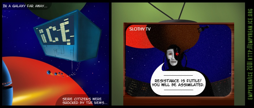 1b. Well, we invited the Seire gang over for cookies and tea and they wouldn't freakin leave! After alot of negotiation (and beer... ), we decided to let them stay for a while. This all seemed great, till they started bringing all their farm animals and strange hollow devices over. And dear lord please make them turn off the Backstreet Boys! If it's not one thing it's another. We're going to need a new couch. Uhg!