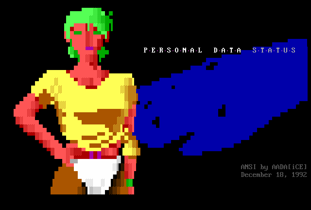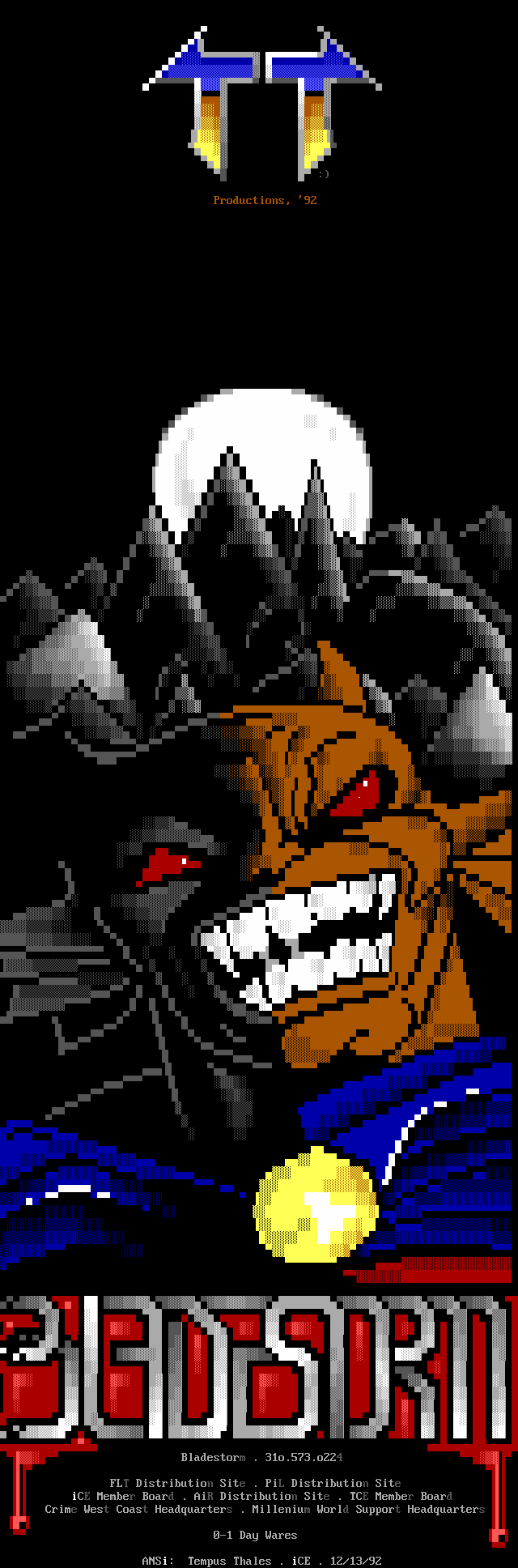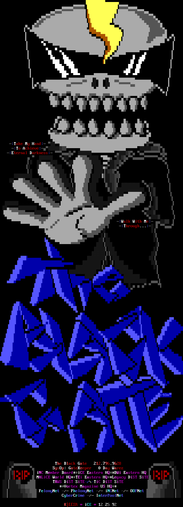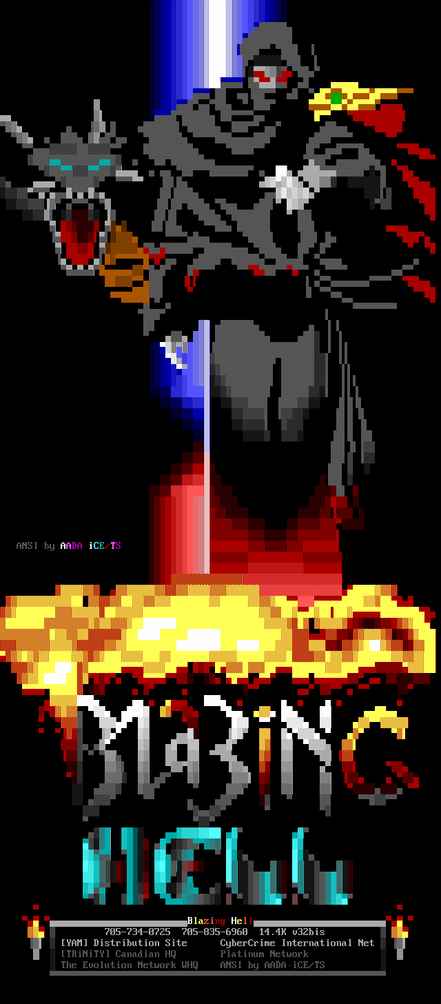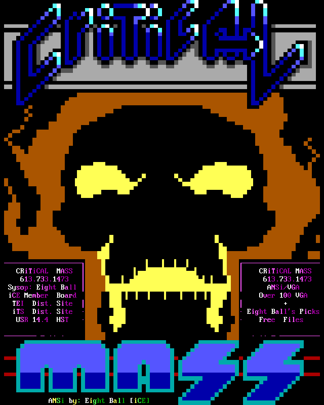 Greets to: Vassago, who was rather miffed that I neglected to mention him in the last iCEPACK after that 1.5 meg animation. Sorry man, I hope this makes up for it. Leviathan, we'll get you that sound routine...eventually :) Captain Kaos, special greets to a member who has helped me out more than I can measure. We need more guys like you bud. Force Ten, as always. No need for detail, tho he'll probably be upset because he wasn't first..heh. Quicksilver, I knew you couldn't beat me bro, but hey! You had me worried there for a while..smile. Dreamevil and Icy-iCE-baby, Way to go guys! Great work this month! (ps. for DE: Face down, ass up! That's the way we like to fuck! laugh) Morbid Angel, long time no talk. Been trying to get in touch with you for awhile, I've been really busy, sorry. Gatekeeper, no LD..AGAIN? :) AADA, Thanks for the ansi man..I'm lovin' it.. she wasn't blonde tho! heh Venom, thanks for the call man. Black Wolf, don't change your handle..it just wouldn't be the same. Black Ire, I hear many rumors about you, but you've always been strait with me. My cat, who's bugging the hell out of me right now cuz she wants food. Nasty Child, thanks for the computer, man.