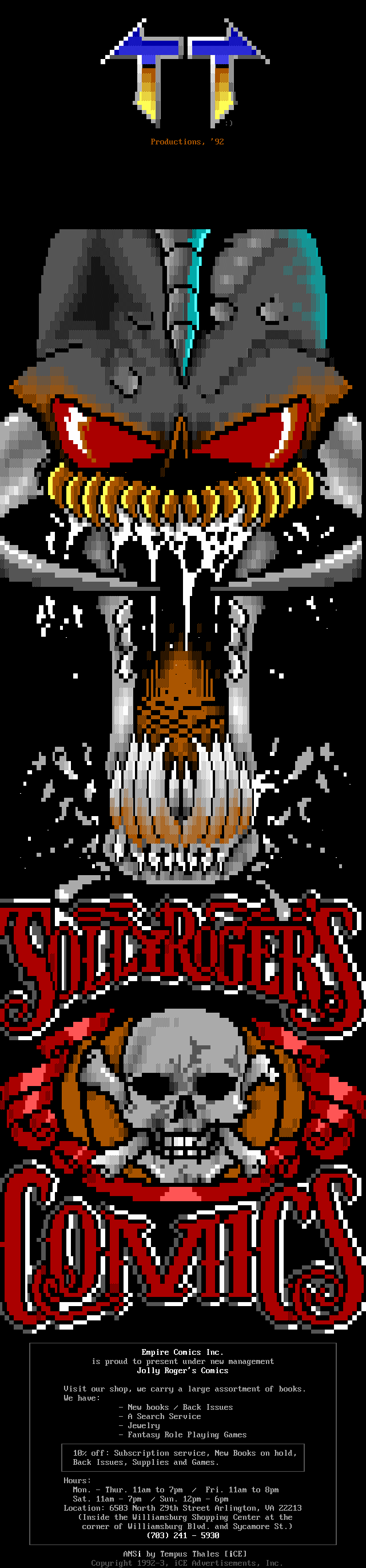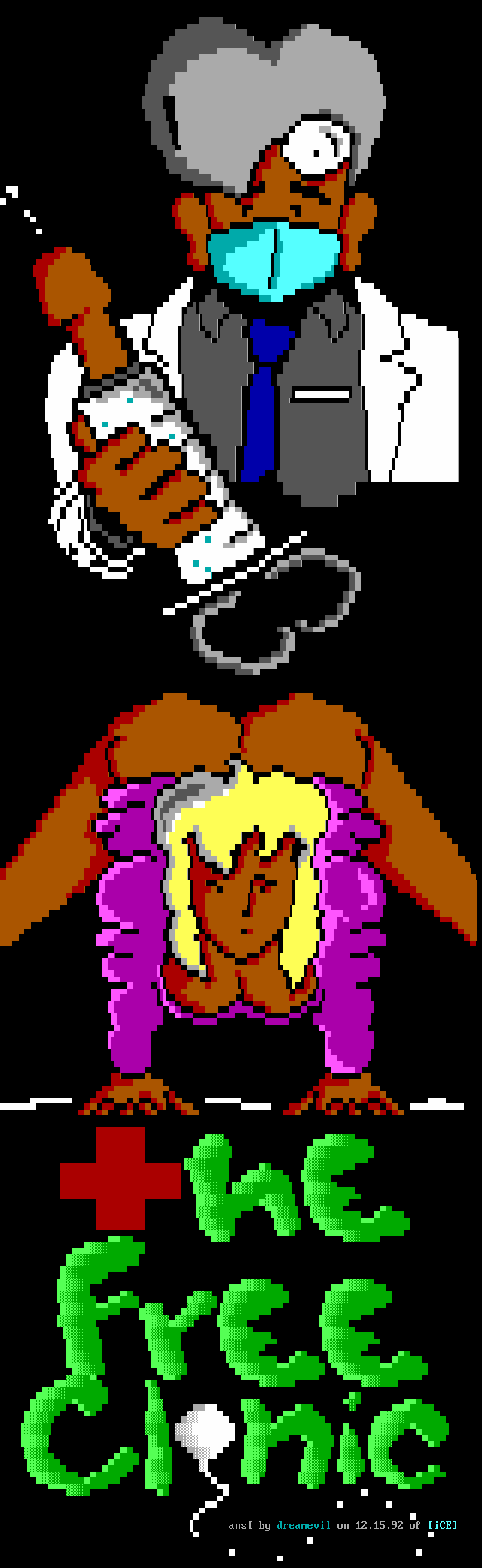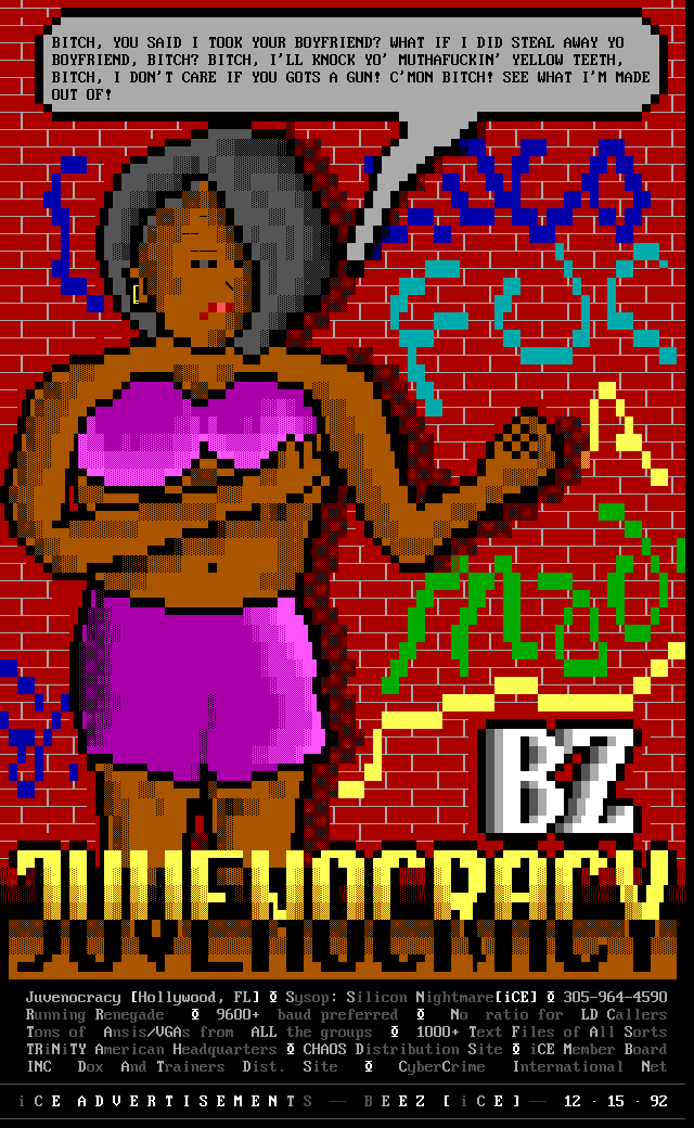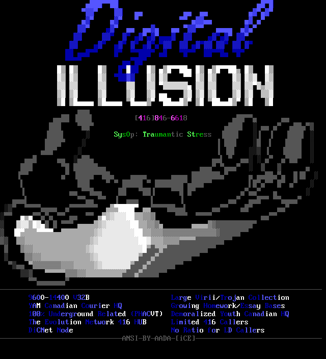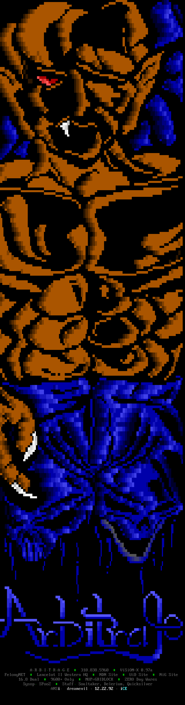 Greets to: Vassago, who was rather miffed that I neglected to mention him in the last iCEPACK after that 1.5 meg animation. Sorry man, I hope this makes up for it. Leviathan, we'll get you that sound routine...eventually :) Captain Kaos, special greets to a member who has helped me out more than I can measure. We need more guys like you bud. Force Ten, as always. No need for detail, tho he'll probably be upset because he wasn't first..heh. Quicksilver, I knew you couldn't beat me bro, but hey! You had me worried there for a while..smile. Dreamevil and Icy-iCE-baby, Way to go guys! Great work this month! (ps. for DE: Face down, ass up! That's the way we like to fuck! laugh) Morbid Angel, long time no talk. Been trying to get in touch with you for awhile, I've been really busy, sorry. Gatekeeper, no LD..AGAIN? :) AADA, Thanks for the ansi man..I'm lovin' it.. she wasn't blonde tho! heh Venom, thanks for the call man. Black Wolf, don't change your handle..it just wouldn't be the same. Black Ire, I hear many rumors about you, but you've always been strait with me. My cat, who's bugging the hell out of me right now cuz she wants food. Nasty Child, thanks for the computer, man.