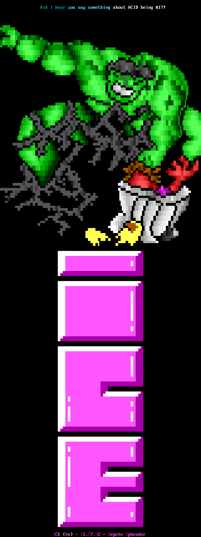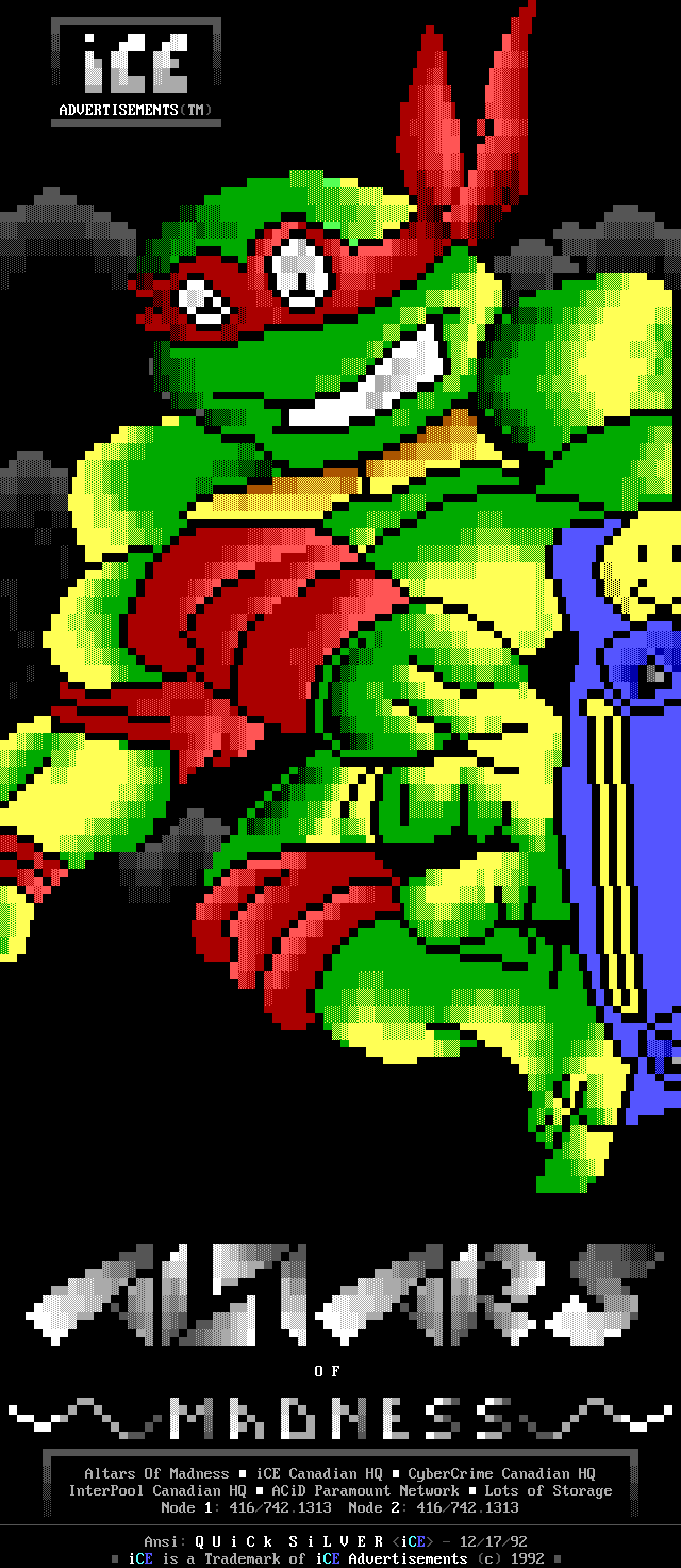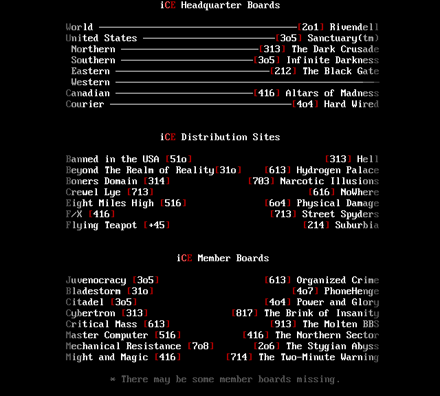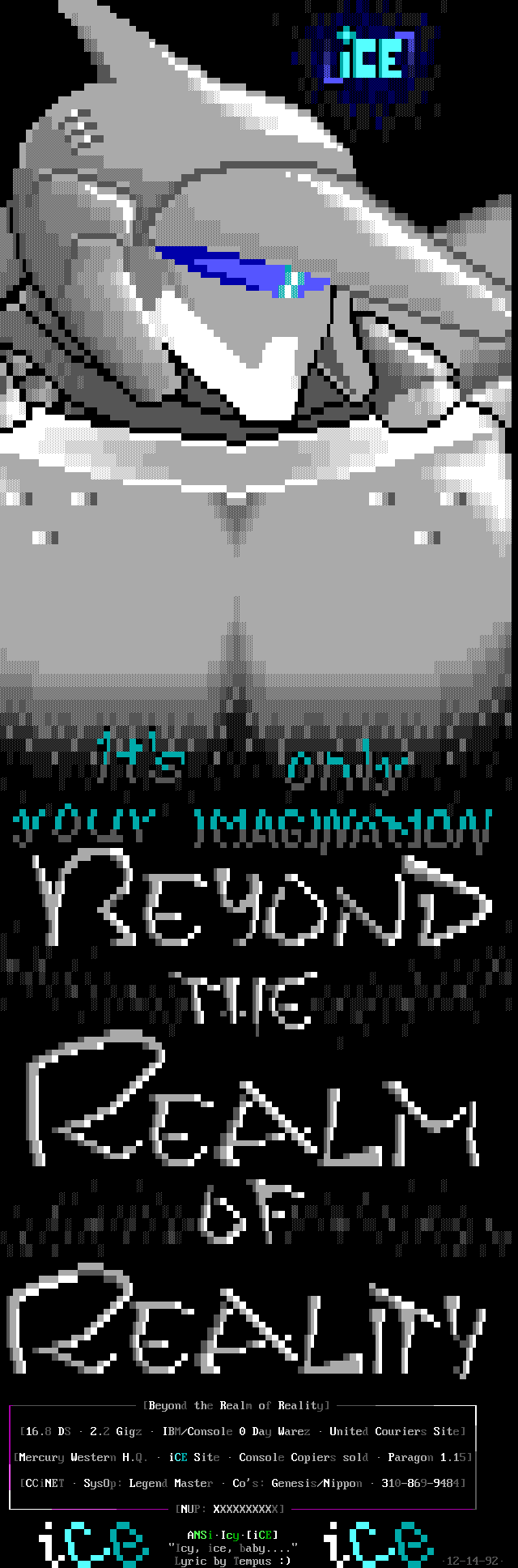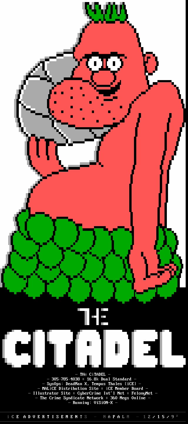 3. The memberlist is now being abridged, and only includes active, and semi- active members. We've heard too many people flippantly say "iCE is too big", but when we ask them to explain they usually cannot come up with a good answer. The most common general idea however, is that we have too many people in the group who appear to do nothing. So, we came up with the solution of creating the memberlist which only includes members who have met the quota for that month (2 full ANSi ads, or 1 VGA for those of you not up on your iCE history). This month's list contains those guys who have done something in the last two months, or I've talked to and I know they're working on something, or some other good excuse :). We will be getting more strict on this, and hopefully the January memberlist will list only those who have met the quota for activity. Note: The virtual iCE Memberlist is much larger than the actual list here in the iCEPACK, there are many iCE members in 'layaway' that come out of hiding every once in awhile. Not being included in the monthly memberlist does NOT mean the person is 'kicked out'. Consider it a temporary demotion due to lack of activity.