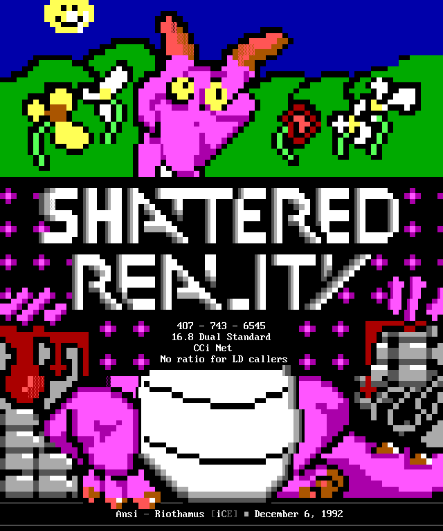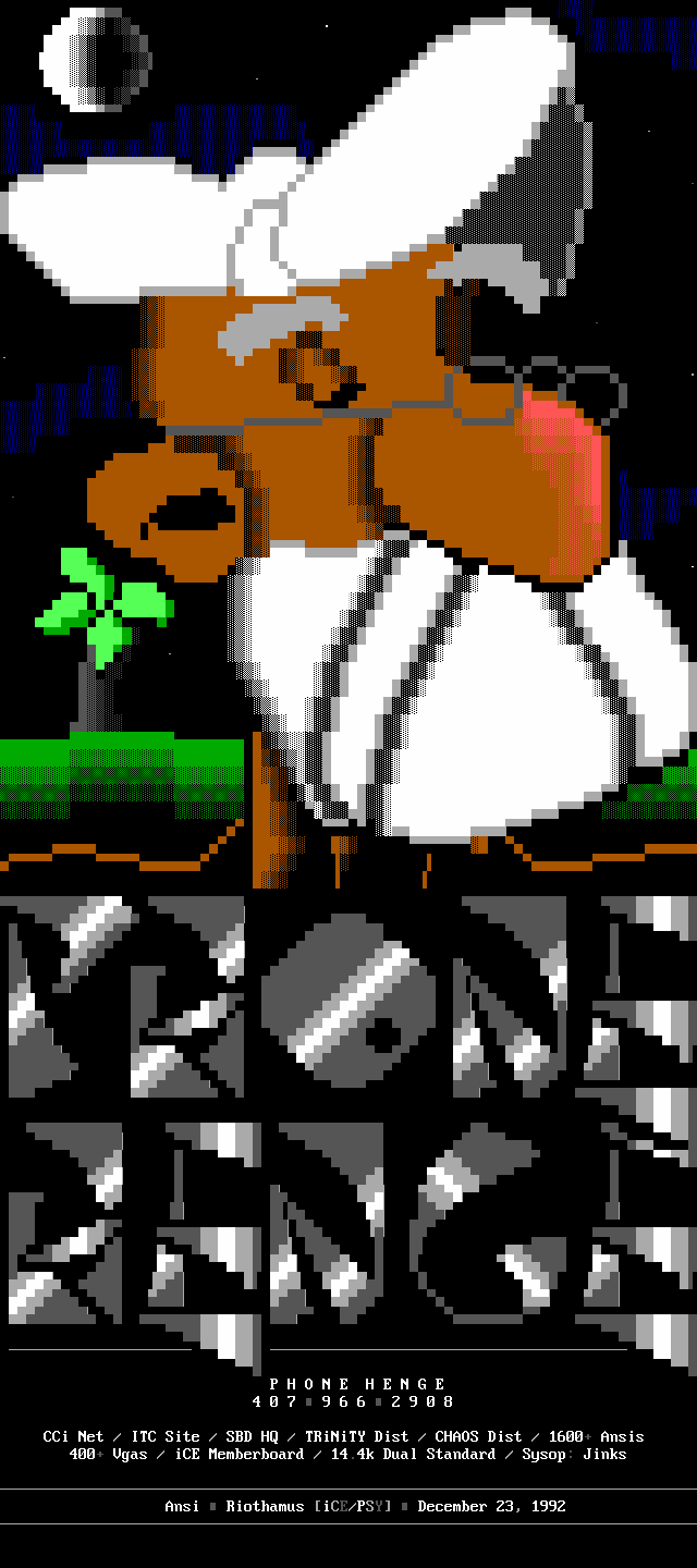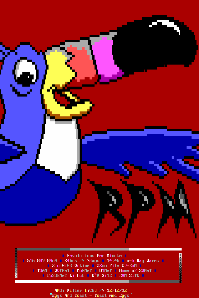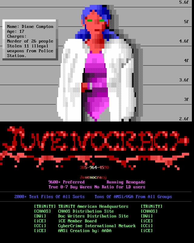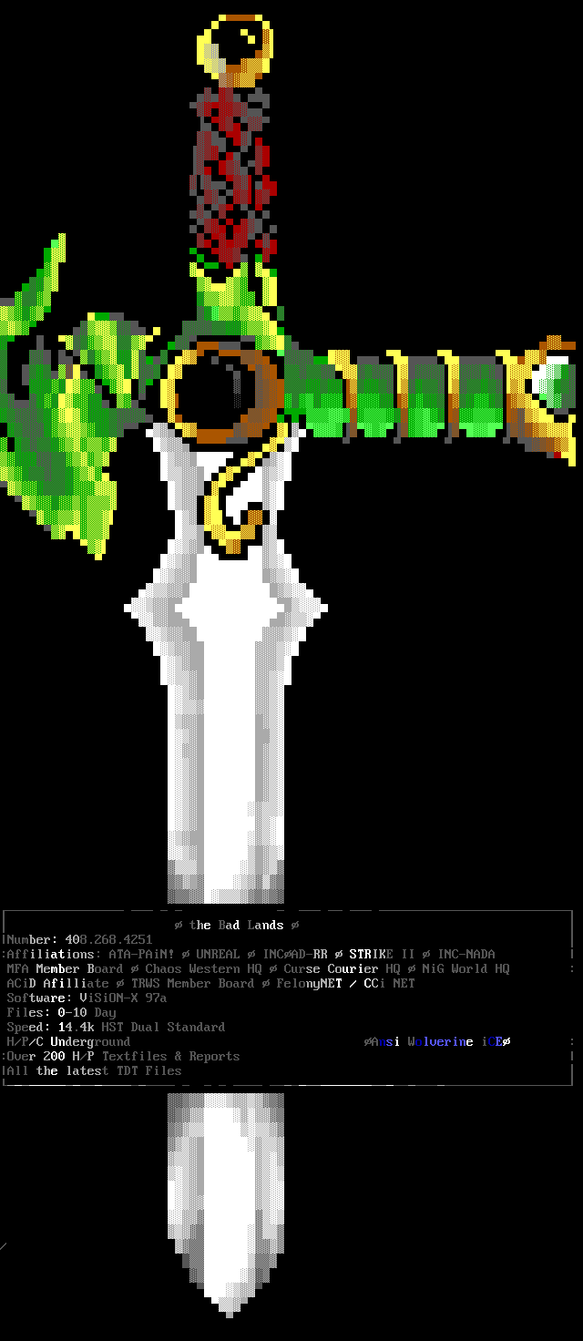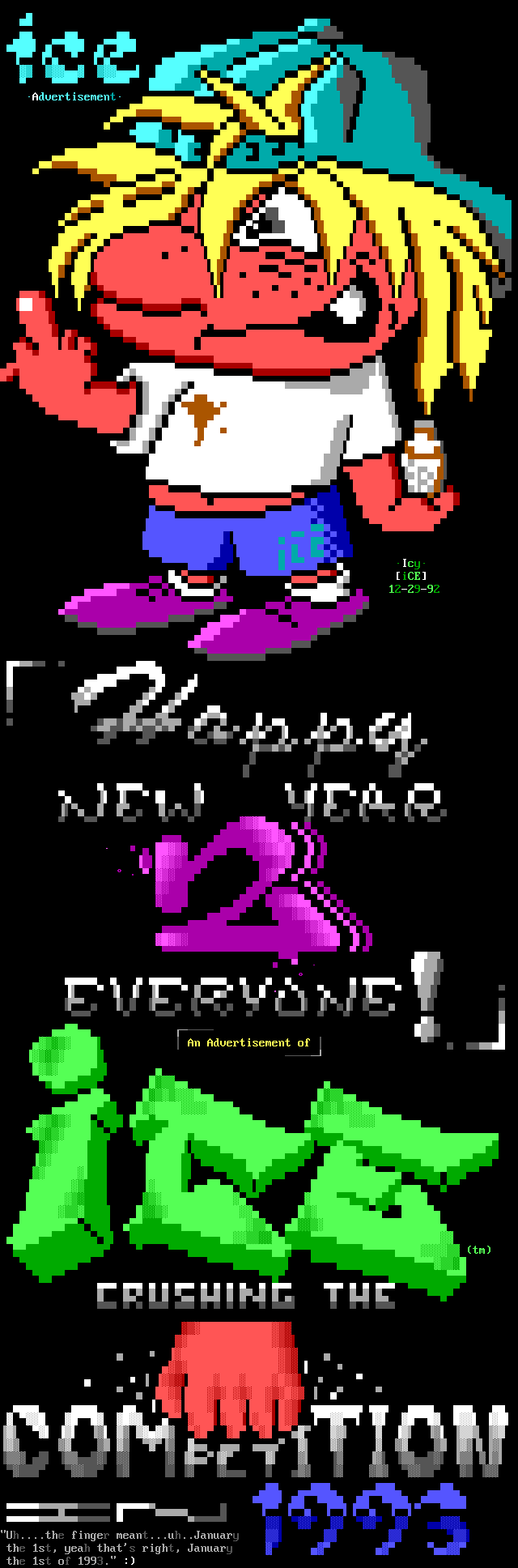 3. The memberlist is now being abridged, and only includes active, and semi- active members. We've heard too many people flippantly say "iCE is too big", but when we ask them to explain they usually cannot come up with a good answer. The most common general idea however, is that we have too many people in the group who appear to do nothing. So, we came up with the solution of creating the memberlist which only includes members who have met the quota for that month (2 full ANSi ads, or 1 VGA for those of you not up on your iCE history). This month's list contains those guys who have done something in the last two months, or I've talked to and I know they're working on something, or some other good excuse :). We will be getting more strict on this, and hopefully the January memberlist will list only those who have met the quota for activity. Note: The virtual iCE Memberlist is much larger than the actual list here in the iCEPACK, there are many iCE members in 'layaway' that come out of hiding every once in awhile. Not being included in the monthly memberlist does NOT mean the person is 'kicked out'. Consider it a temporary demotion due to lack of activity.