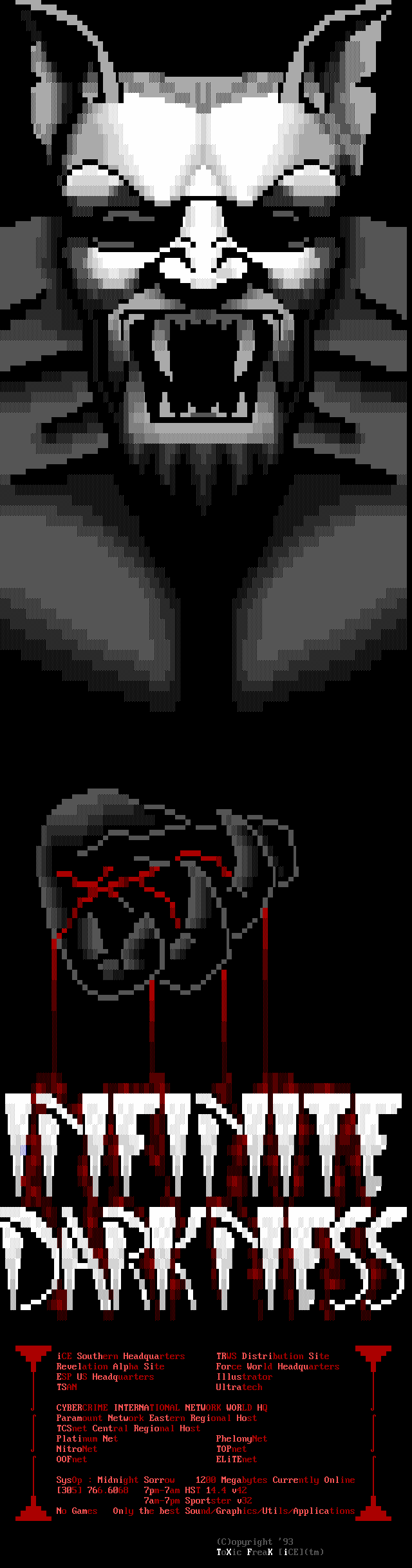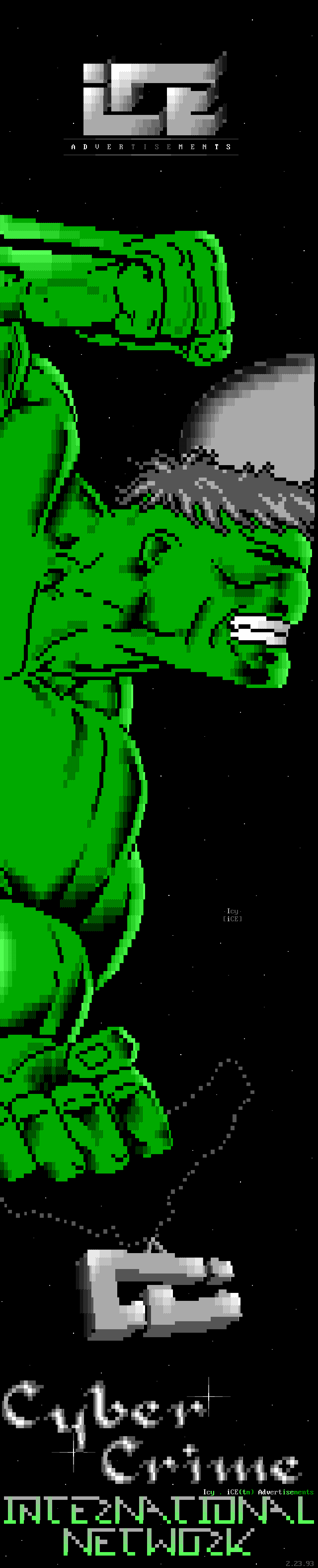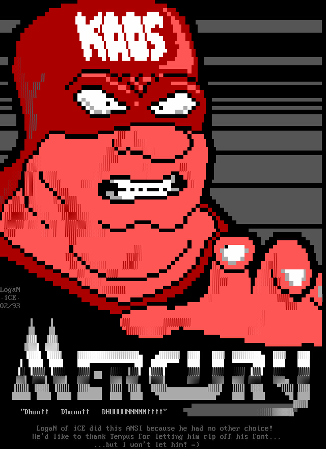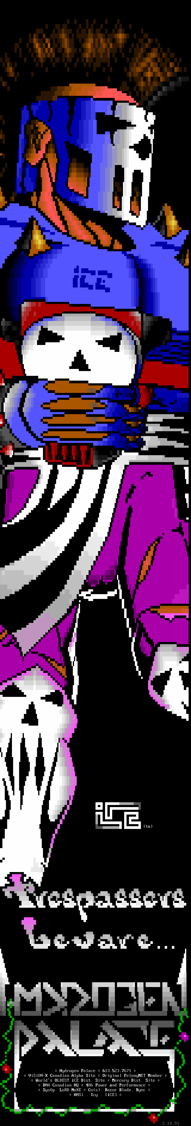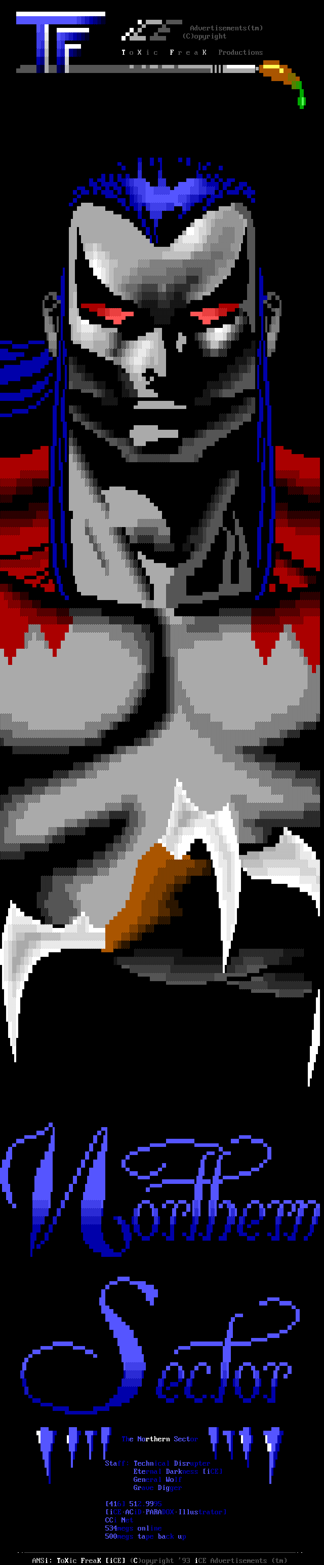 Welcome, welcome! -- Toxic Freak, from the famed northern sector up in the 'frozen wastelands of canada' (quote copyright 1992 paul muad'dib. all rights reserved :>) is perhaps one of the brightest new talents in the ANSI scene. He began drawing ANSI about three weeks ago and has shown remarkable improvement. In the future, watch for him being one of the best in the world. -- Leper Messiah, formerly of Spit, has joined the group after a pretty impressive iCE Trial period which showed remarkable improvement. Working with Shihear Kallizad, Leper has become quite a prominent artist. -- In the coding section of iCE, we welcome two new members! The first, The Shadow, formerly of ACiD, has joined up with iCE to work with Eight Ball and Mad Hatter up in Ontario on VGAs/Demos. The second, Ford Prefect, is a coder from Israel. Welcome aboard! -- Finally, another late welcome to Metal Head, Senior Staff member. He was left out in the December pack's .NFO so I figured we'll greet him TWICE in a row. Do-verrrrr....