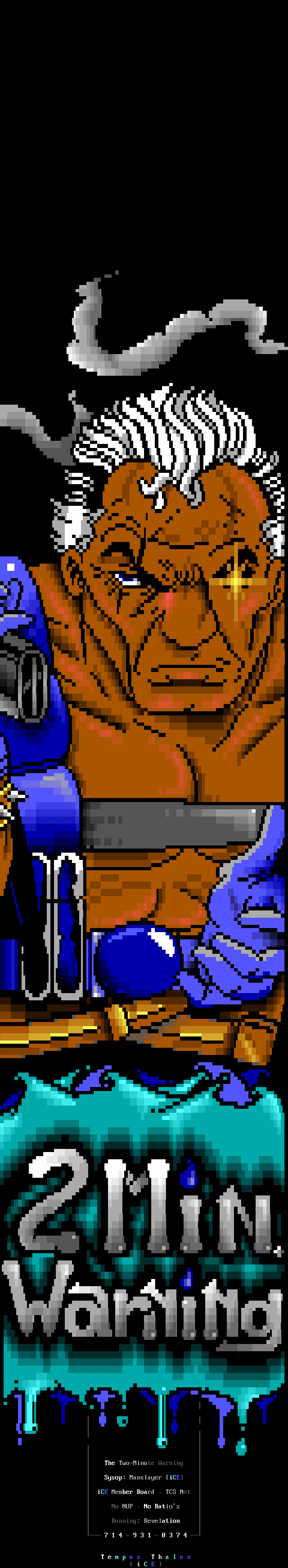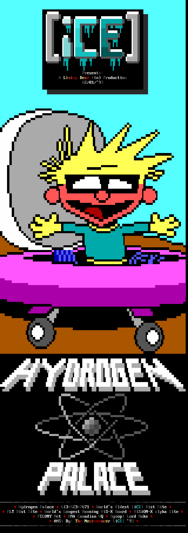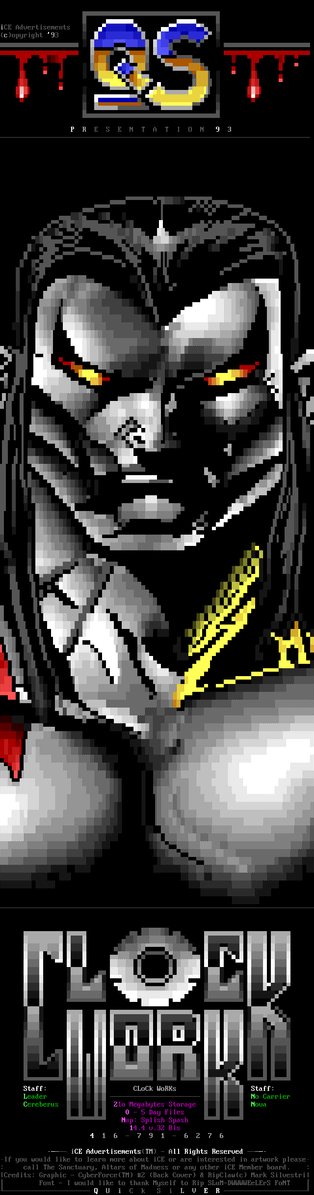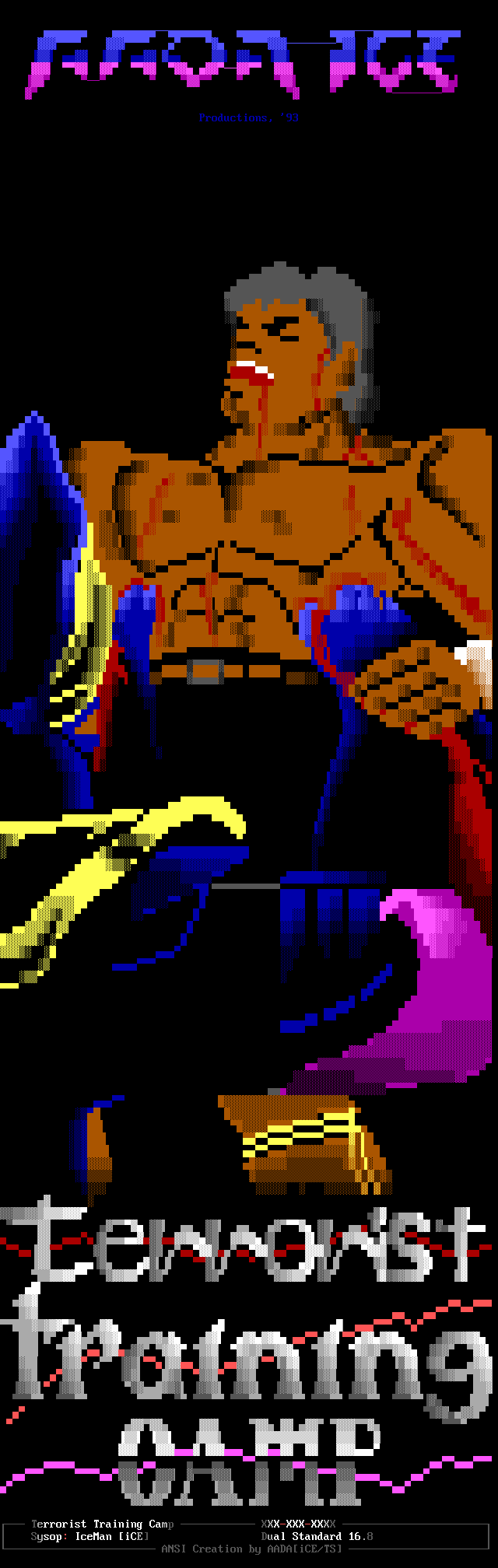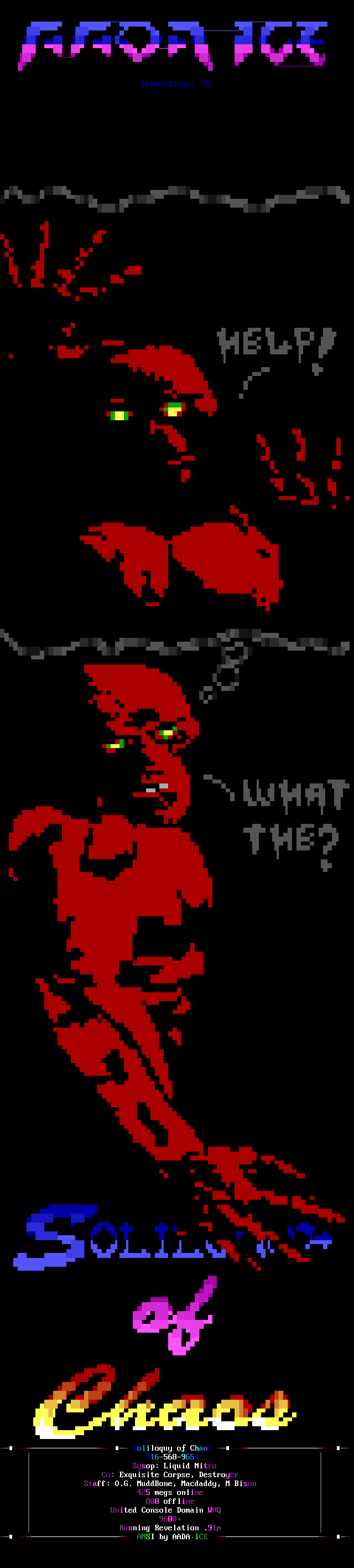 Welcome, welcome! -- Toxic Freak, from the famed northern sector up in the 'frozen wastelands of canada' (quote copyright 1992 paul muad'dib. all rights reserved :>) is perhaps one of the brightest new talents in the ANSI scene. He began drawing ANSI about three weeks ago and has shown remarkable improvement. In the future, watch for him being one of the best in the world. -- Leper Messiah, formerly of Spit, has joined the group after a pretty impressive iCE Trial period which showed remarkable improvement. Working with Shihear Kallizad, Leper has become quite a prominent artist. -- In the coding section of iCE, we welcome two new members! The first, The Shadow, formerly of ACiD, has joined up with iCE to work with Eight Ball and Mad Hatter up in Ontario on VGAs/Demos. The second, Ford Prefect, is a coder from Israel. Welcome aboard! -- Finally, another late welcome to Metal Head, Senior Staff member. He was left out in the December pack's .NFO so I figured we'll greet him TWICE in a row. Do-verrrrr....
