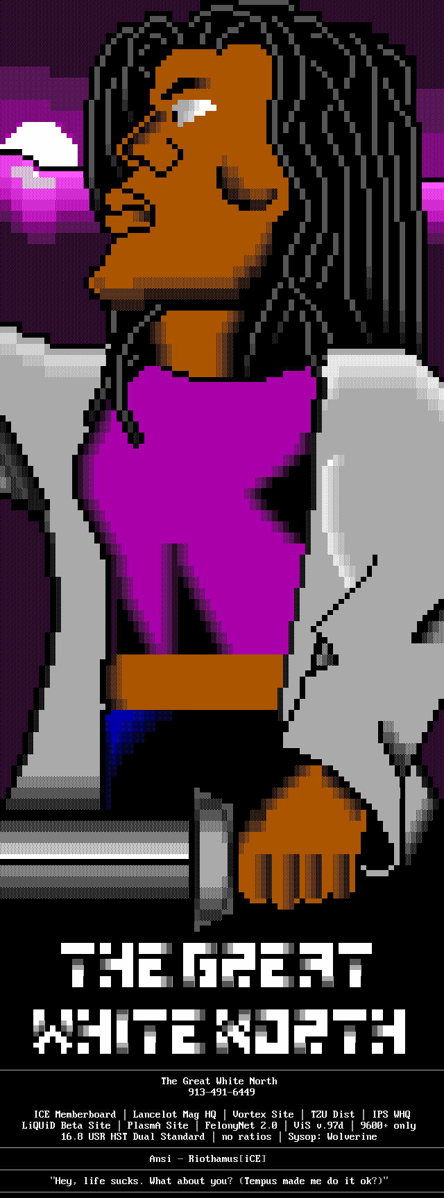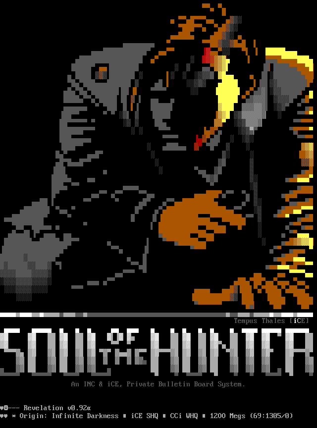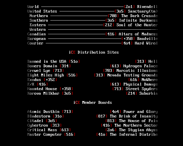 Greets to: Tempus Thales: Someone better find you a JOB! Metal Head: Thanks for all the help, guy. Midnight Sorrow: Keep up the good work - you're our best helper and supporter. Genesis/boys: Welcome aboard.. hope you'll be in for a long time. Quick Silver: Absolutely no hard feelings.. Welcome back to the 'swing of things'. Eternal Darkness: Can we make the bunny the official iCE Mascot? Blade Runner: Hey where's that ANSI? Need a board? Rivendell? Tormented Soul: Once again, a heads-up play. Master of Puppets: Music to my ears! Keep it up! Toxic Freak: Amazing, and you just started! Logan: Have fun in the play, come back soon. Marshal Law: Luck will find you soon.. Hold your head up. Black Wolf: Thanks for always entrusting me when you were having trouble with others - and letting us work out what was needed. We're holding up our end like I promised. Captain Kaos: Thanks for the 'goods'. Eight Ball: Ottawa Senators. Hehe. When are you going to emigrate and get it over with? Lord Mischief: I have another question for your mom.. :>