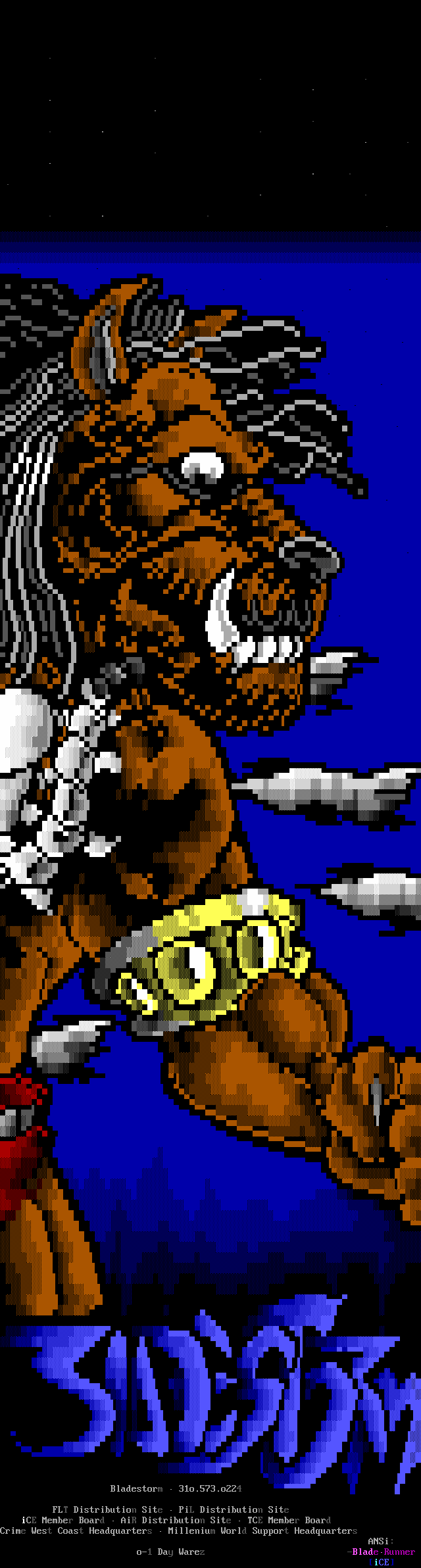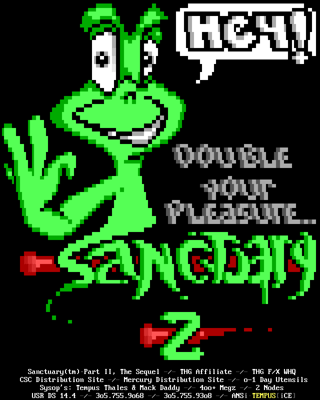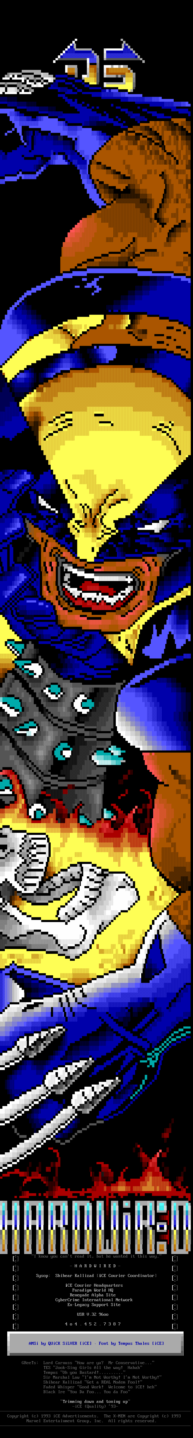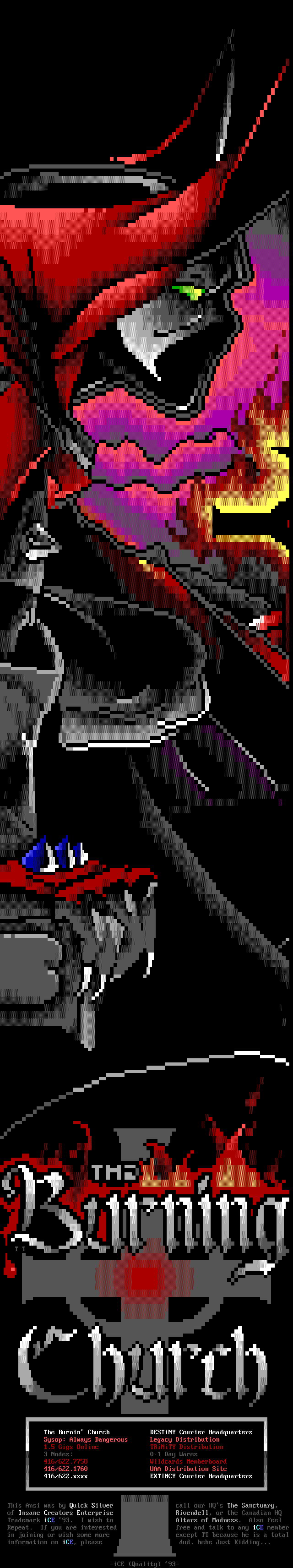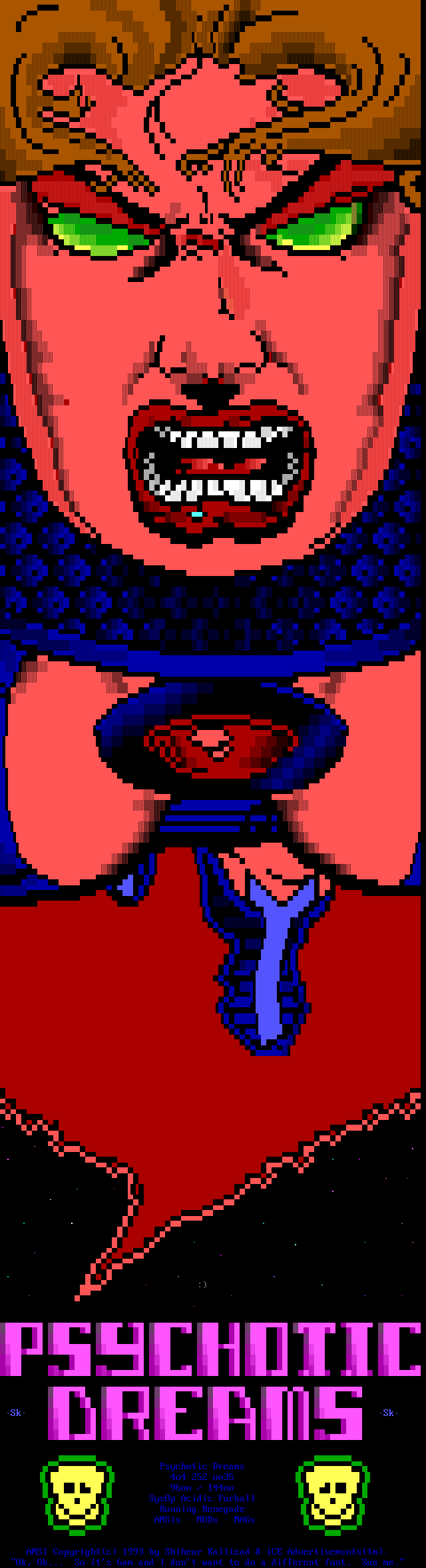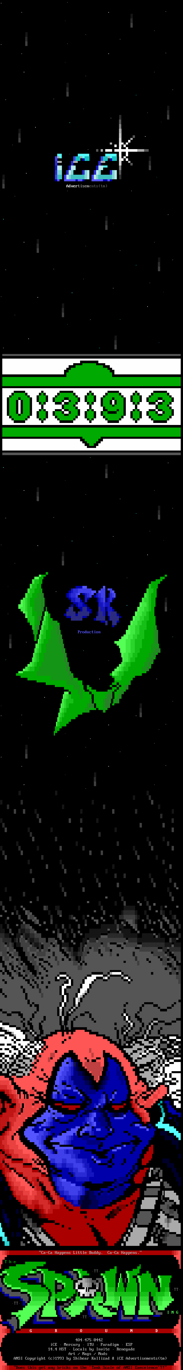 Greets to: Force Ten - "ZZZZZZzzzzzzzzz........ .. ." How 'bout those VGA artists? :) Mitch - Why do you even have a handle? We want CCi (repeat as desired) Captain Kaos - M-i-C (Couriers, pft.) K-E-Y (Bah, they suck.) M-O-U-S-E! "Fuck this. I'm going to Disney World!" Lord Carnuss - I got your competition...riiigght here bud. Grin. "Can't wait for your next ansi in July" -SK QUiCK SiLVER - Year to date, QS vs SK: QS ahead, but 9 months still to go! Stay tuned! SharP - iCE is a BUS? A BUS?! I guess that makes ACiD a Pinto :) Tank - I hope we provided you with some more bricks this month... :) Dreamevil - Glad you stayed in the game, Yuan-San. AADA - Great pair of ads this month..by far your best! ED - "Ed...back from the dead?" Napalm - C'mon guy.. where's that promise you'd showed?
