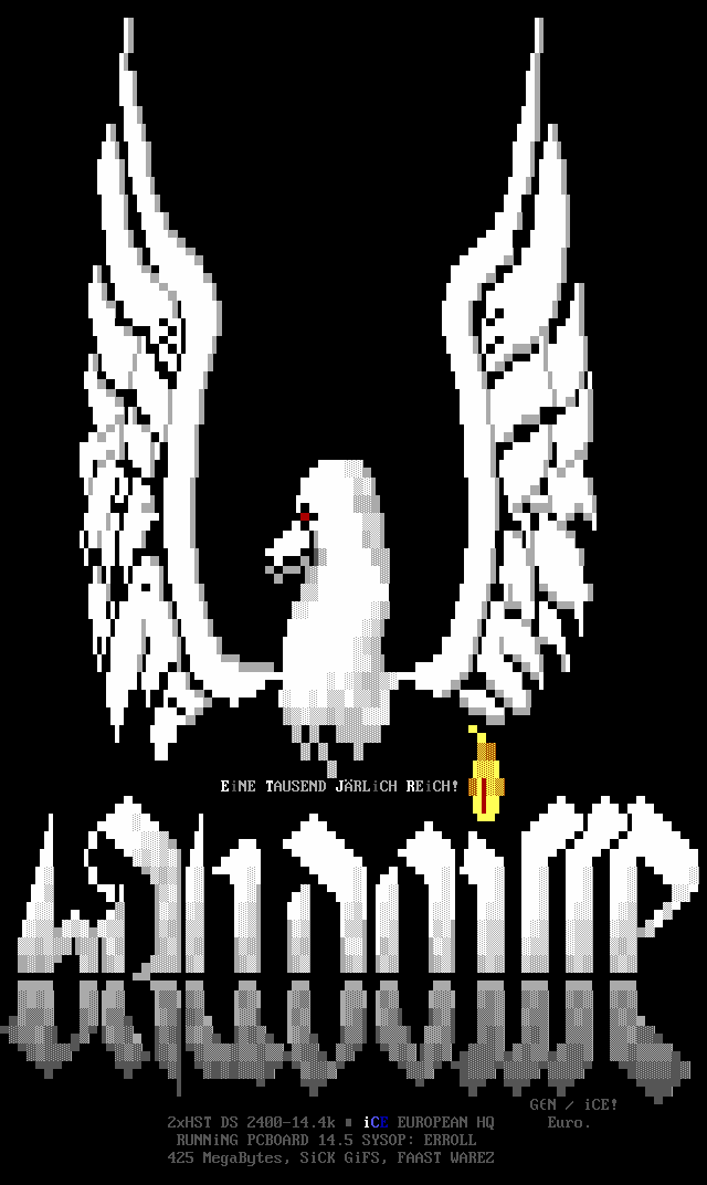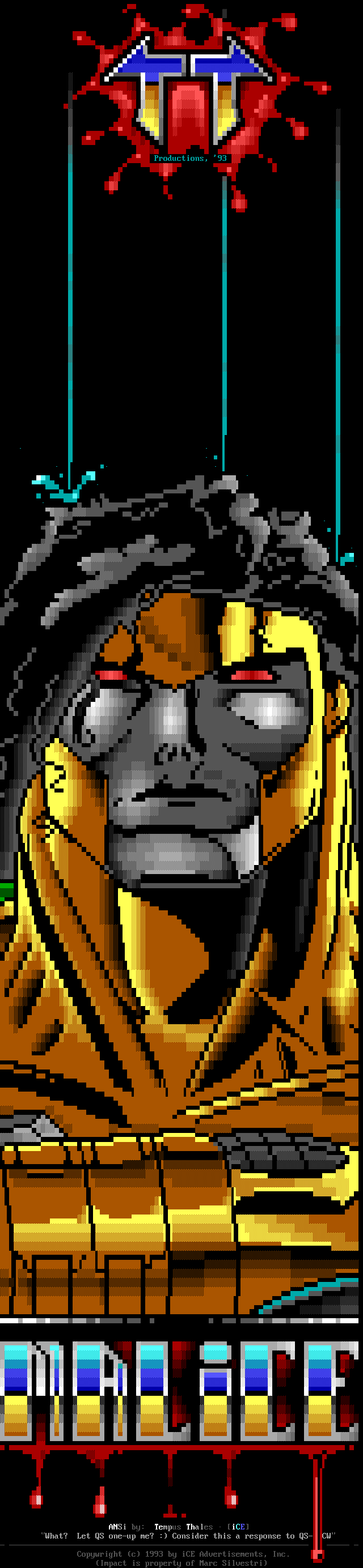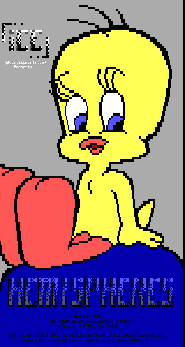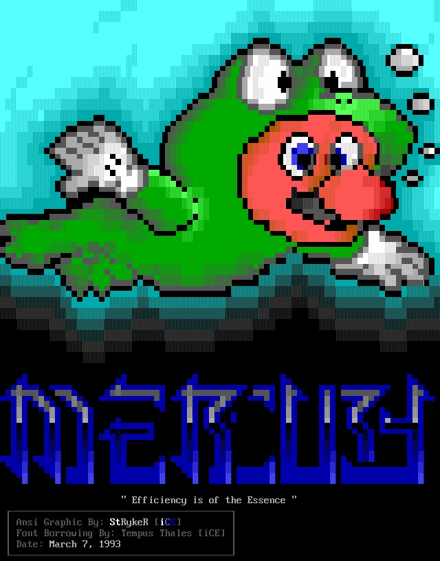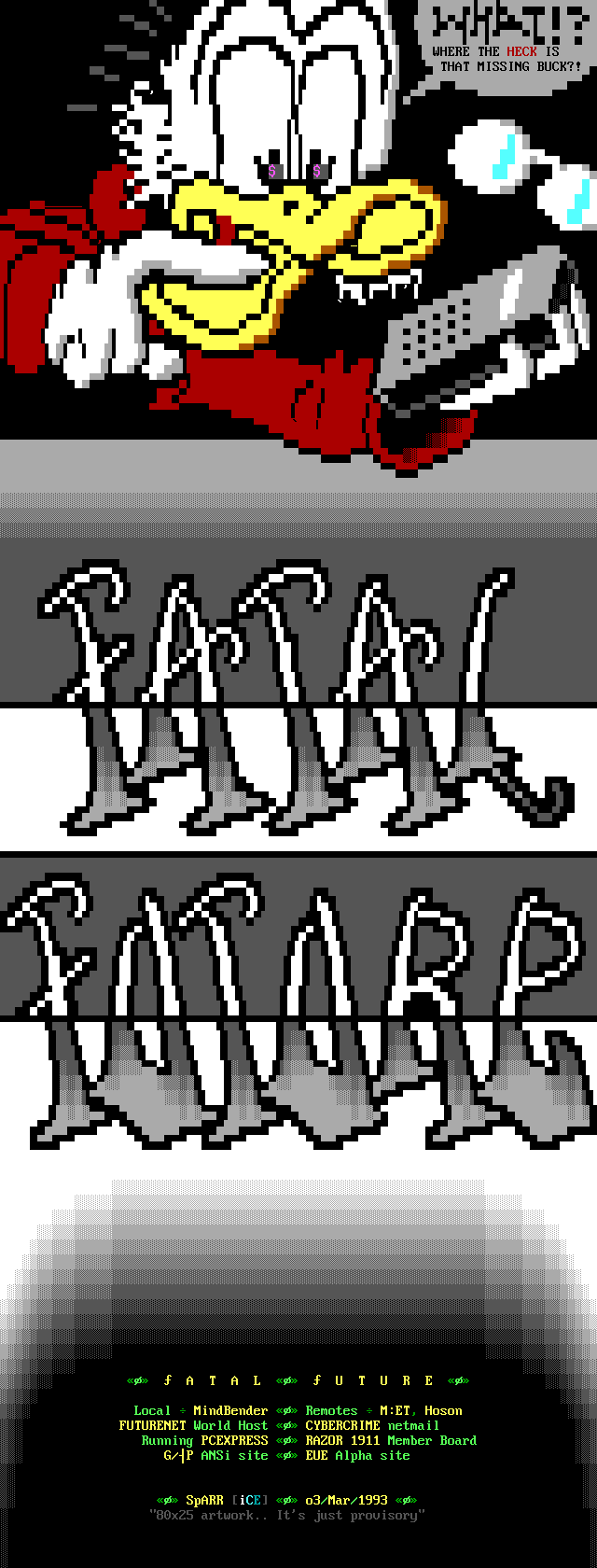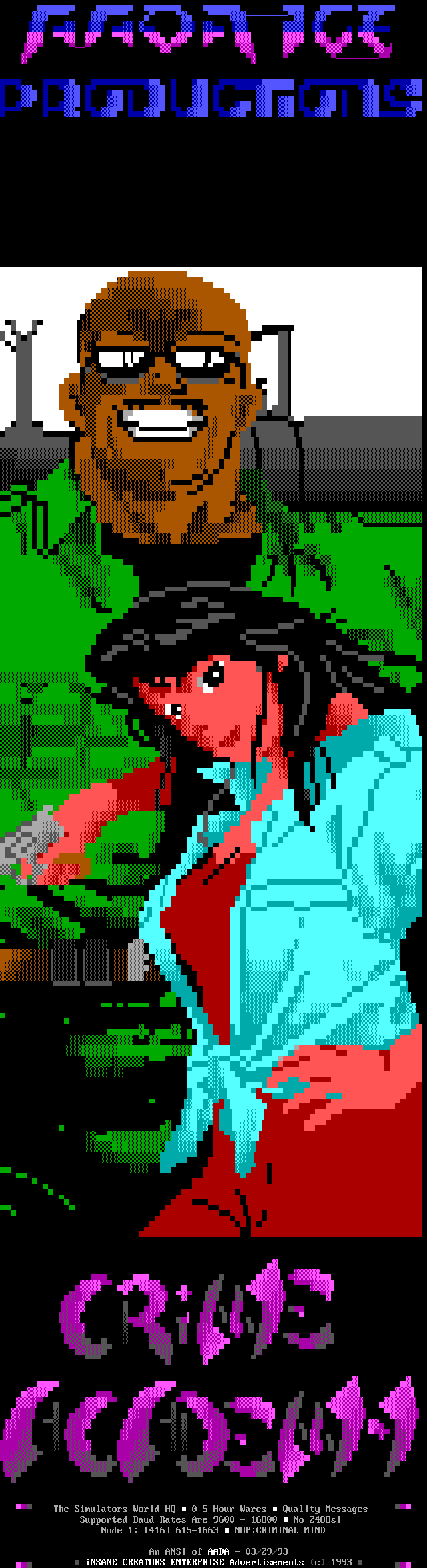 Greets to: Force Ten - "ZZZZZZzzzzzzzzz........ .. ." How 'bout those VGA artists? :) Mitch - Why do you even have a handle? We want CCi (repeat as desired) Captain Kaos - M-i-C (Couriers, pft.) K-E-Y (Bah, they suck.) M-O-U-S-E! "Fuck this. I'm going to Disney World!" Lord Carnuss - I got your competition...riiigght here bud. Grin. "Can't wait for your next ansi in July" -SK QUiCK SiLVER - Year to date, QS vs SK: QS ahead, but 9 months still to go! Stay tuned! SharP - iCE is a BUS? A BUS?! I guess that makes ACiD a Pinto :) Tank - I hope we provided you with some more bricks this month... :) Dreamevil - Glad you stayed in the game, Yuan-San. AADA - Great pair of ads this month..by far your best! ED - "Ed...back from the dead?" Napalm - C'mon guy.. where's that promise you'd showed?