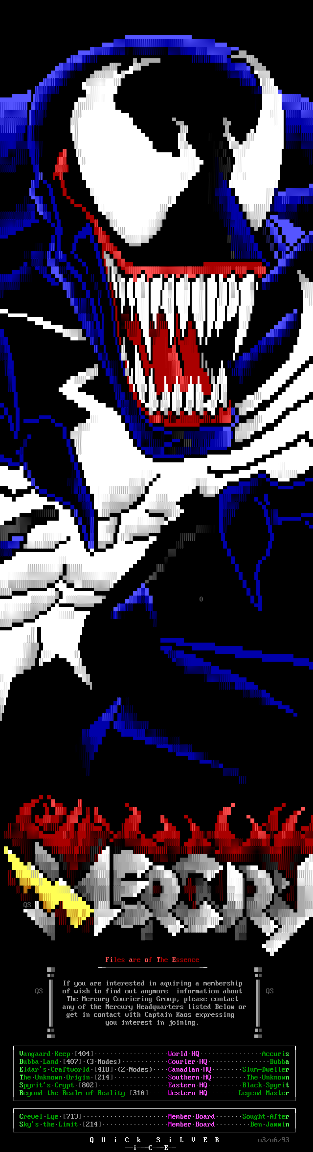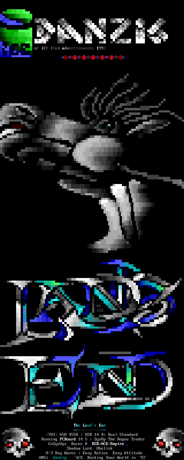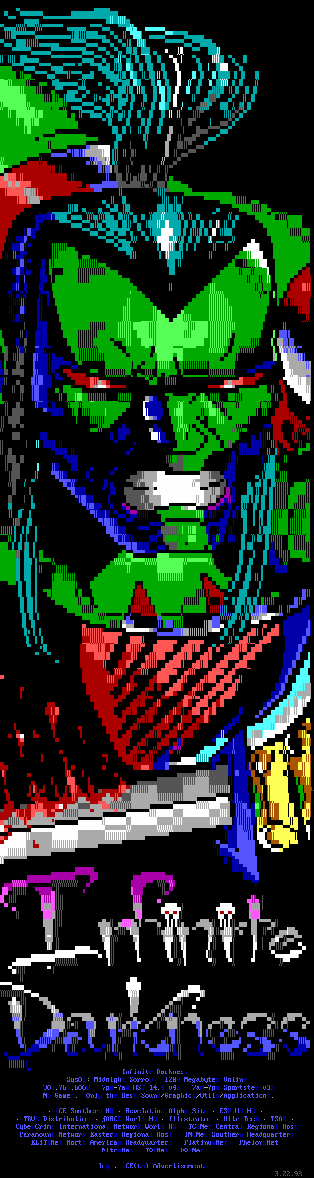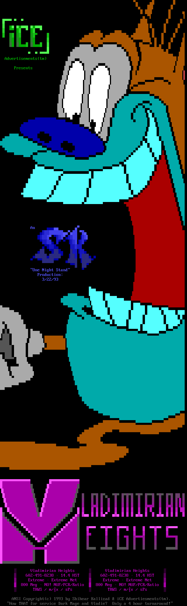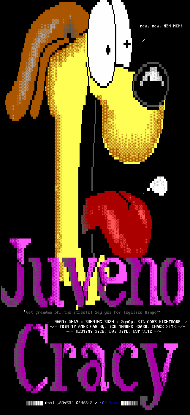 Greets to: Force Ten - "ZZZZZZzzzzzzzzz........ .. ." How 'bout those VGA artists? :) Mitch - Why do you even have a handle? We want CCi (repeat as desired) Captain Kaos - M-i-C (Couriers, pft.) K-E-Y (Bah, they suck.) M-O-U-S-E! "Fuck this. I'm going to Disney World!" Lord Carnuss - I got your competition...riiigght here bud. Grin. "Can't wait for your next ansi in July" -SK QUiCK SiLVER - Year to date, QS vs SK: QS ahead, but 9 months still to go! Stay tuned! SharP - iCE is a BUS? A BUS?! I guess that makes ACiD a Pinto :) Tank - I hope we provided you with some more bricks this month... :) Dreamevil - Glad you stayed in the game, Yuan-San. AADA - Great pair of ads this month..by far your best! ED - "Ed...back from the dead?" Napalm - C'mon guy.. where's that promise you'd showed?