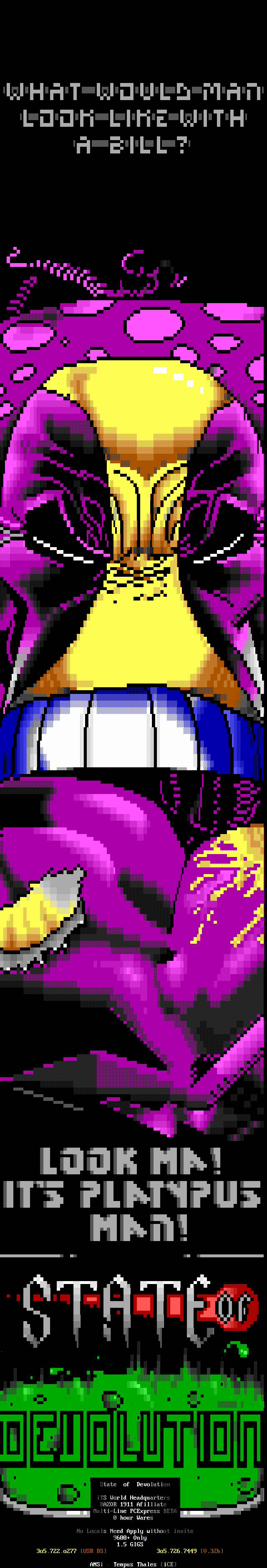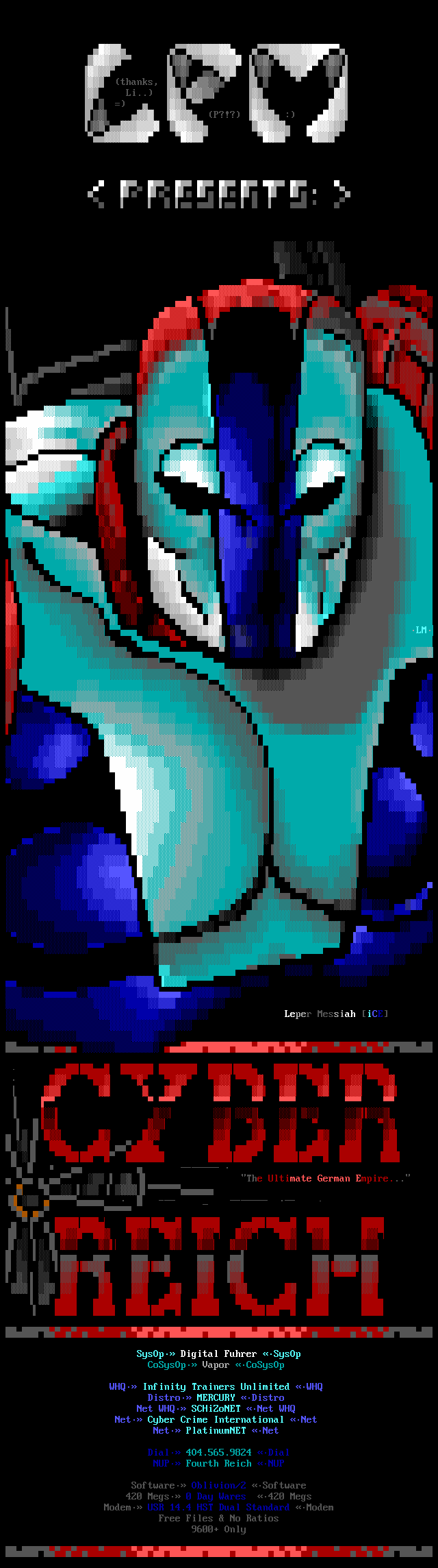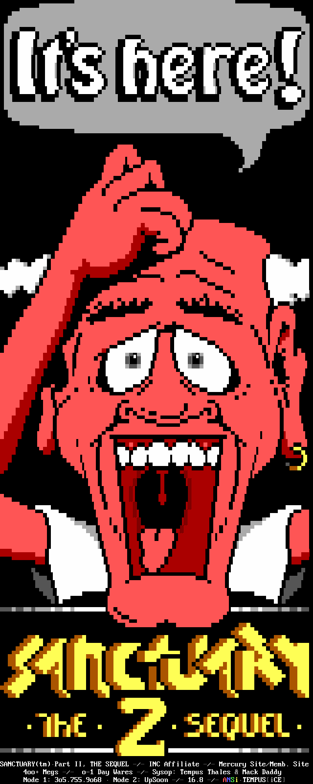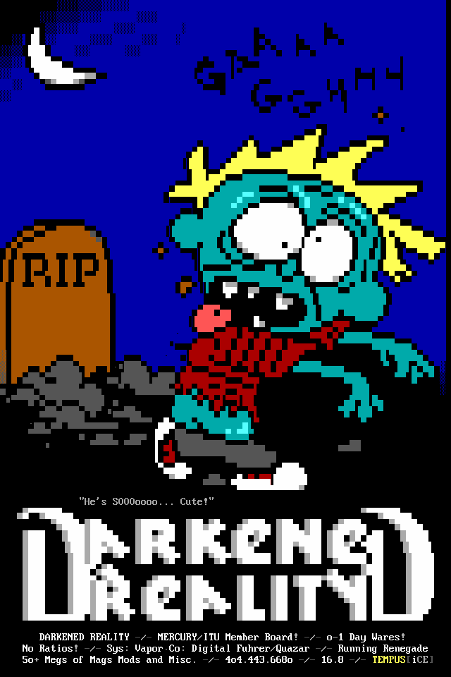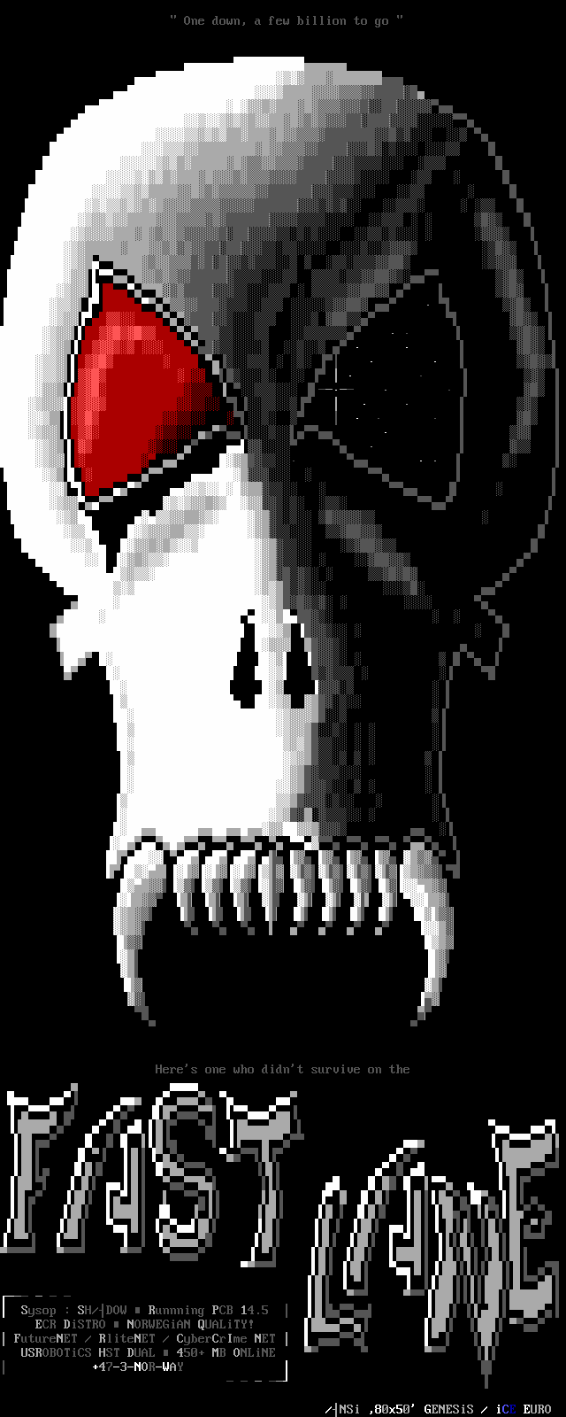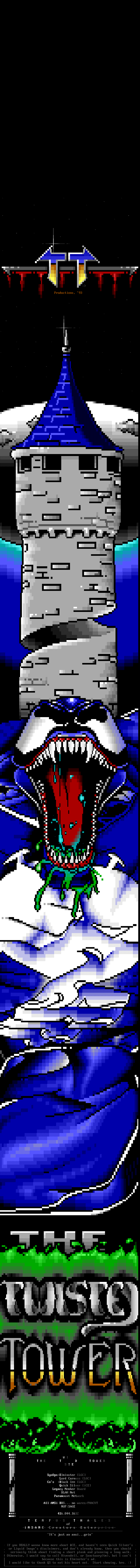 Greets to: Force Ten - "ZZZZZZzzzzzzzzz........ .. ." How 'bout those VGA artists? :) Mitch - Why do you even have a handle? We want CCi (repeat as desired) Captain Kaos - M-i-C (Couriers, pft.) K-E-Y (Bah, they suck.) M-O-U-S-E! "Fuck this. I'm going to Disney World!" Lord Carnuss - I got your competition...riiigght here bud. Grin. "Can't wait for your next ansi in July" -SK QUiCK SiLVER - Year to date, QS vs SK: QS ahead, but 9 months still to go! Stay tuned! SharP - iCE is a BUS? A BUS?! I guess that makes ACiD a Pinto :) Tank - I hope we provided you with some more bricks this month... :) Dreamevil - Glad you stayed in the game, Yuan-San. AADA - Great pair of ads this month..by far your best! ED - "Ed...back from the dead?" Napalm - C'mon guy.. where's that promise you'd showed?