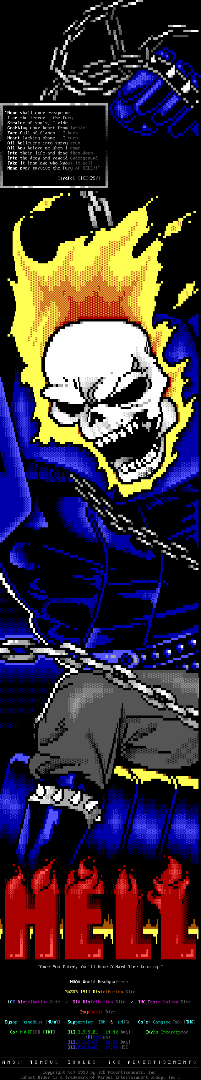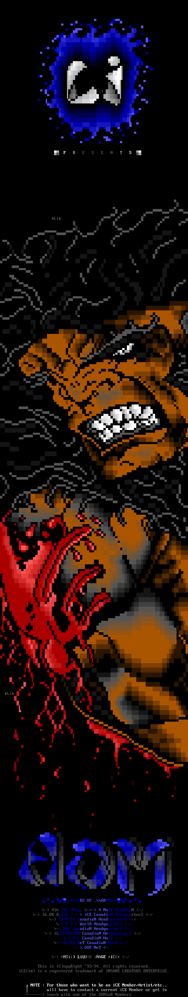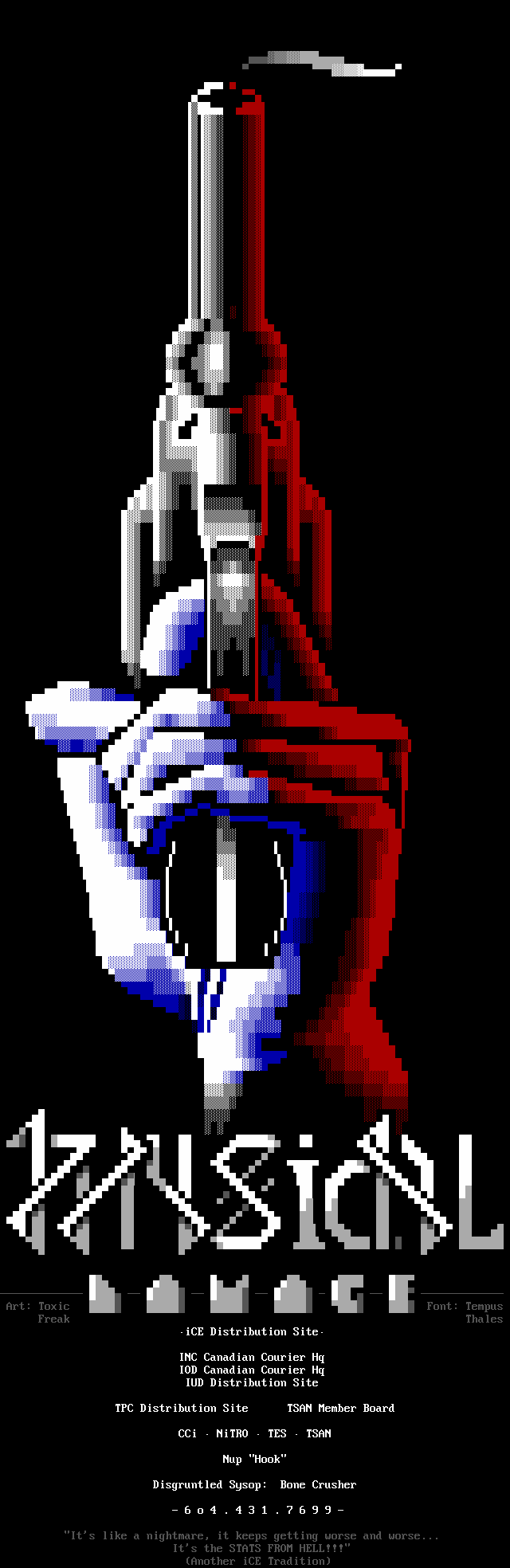 5. *NOTE* To All iCE Sites: If you are the sysop of an iCE Site, it is important for you to be aware that it's up to YOU to inform us if there is a problem with your courier. If you are not receiving the iCEPACK after a reasonable amount of time, make sure you let either the CC, or a Staff member know. If we could make rounds to check up on all the sites we would, but it's simply not feasable. In a similar note: We aren't able to talk to all the artists all the time either so, if you (as an iCE Artist or Member) have a problem or need something taken care of, or just want to keep in touch, please contact: Genesis, Metal Head, Ricochet, Shihear Kallizad, Sought After, The BBS Bouncer, or Tormented Soul. Any one of these people can handle your problem, keep you up to date on recent iCE events, or readily contact a staff member if it's warranted.