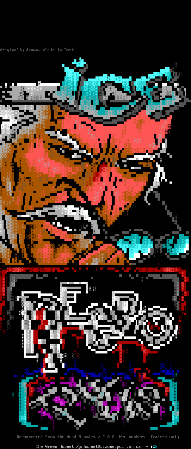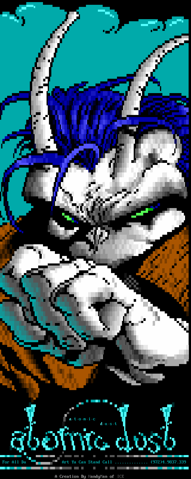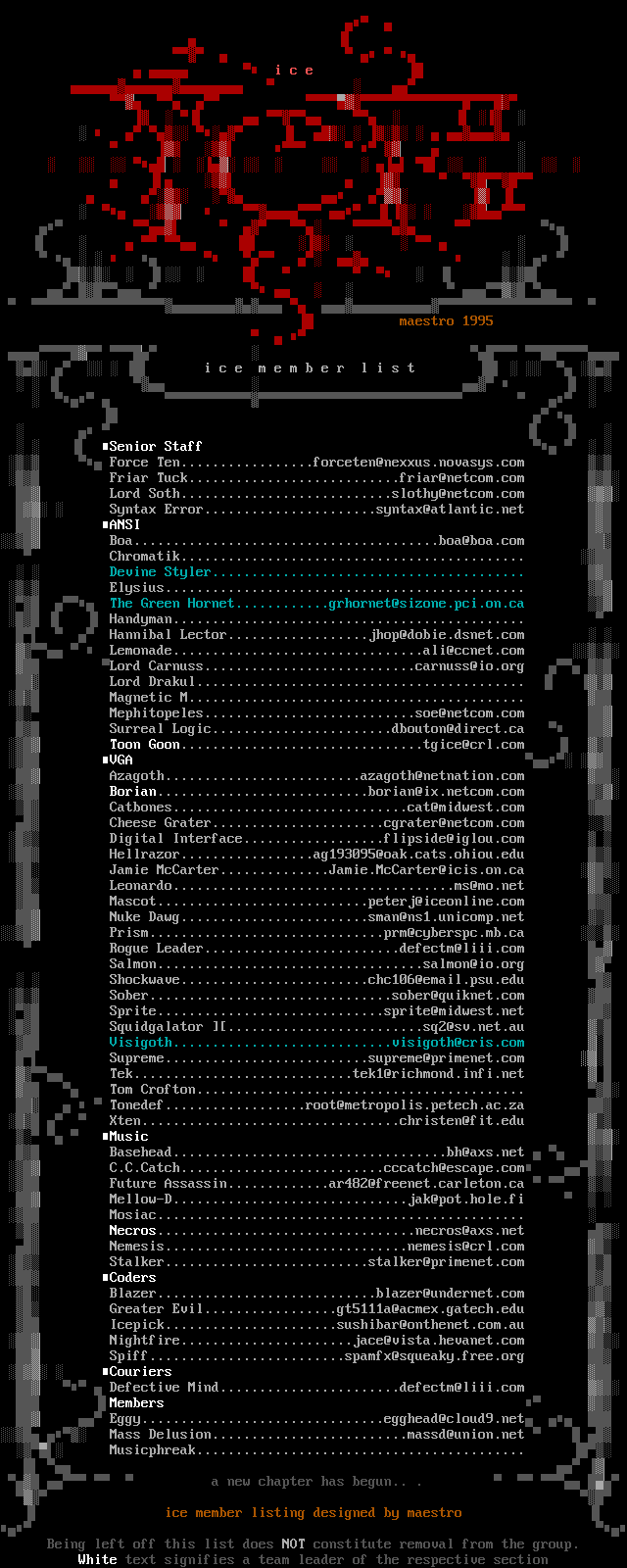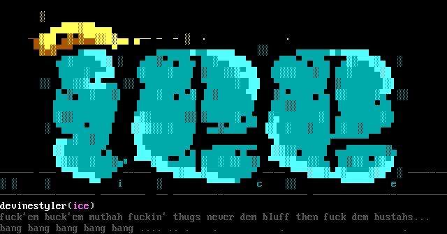 4. On a more serious note, iCE would like to extend a warm welcome to a few new cohorts in artistic representation. (uh, that's like, doodleboys and stuff -BH yeah! m m heh heh m -B) They are: Visigoth, VGA Studmuffin, Devine Styler, ANSI Starlet, and The Green Hornet, ANSI Insect and overall super guy. Yep. That's as serious as it gets when I do the .NFO file, folks.