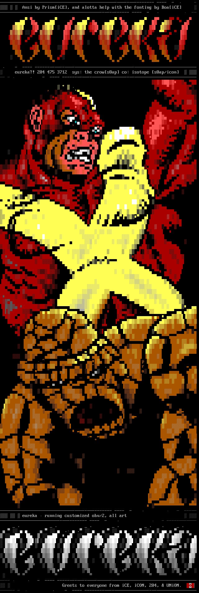 12�.I needed somewhere to apologize, so I'll squeeze them in here, between 12 and 14. First I want to apologize to Supreme for leaving him out of the memberlist accidentally. Then I want to apologize to Hellrazor for leaving him out of the memberlist AND forgetting to mention that he joined in the NFO. Finally I want to apologize to Splint and Surreal Logic. After forgetting to release the US-VIT1.ICE ansi 2 months ago, I released it last month, although I forgot to change the font to VOTB. This is what I'd call an unlucky ansi, and a BAD month for me. So although Splint refused a free ansi, I did one for Surreal Logic, since he got screwed out of an ansi. Hey, we're not perfect here in the iCE Pastures, but when I find that I make a mistake it really hurts, and I don't expect others to suffer from my mistakes. So SL, my most sincere apologies, enjoy the ansi :). Splint, I still owe you for putting up with me. -Slothy