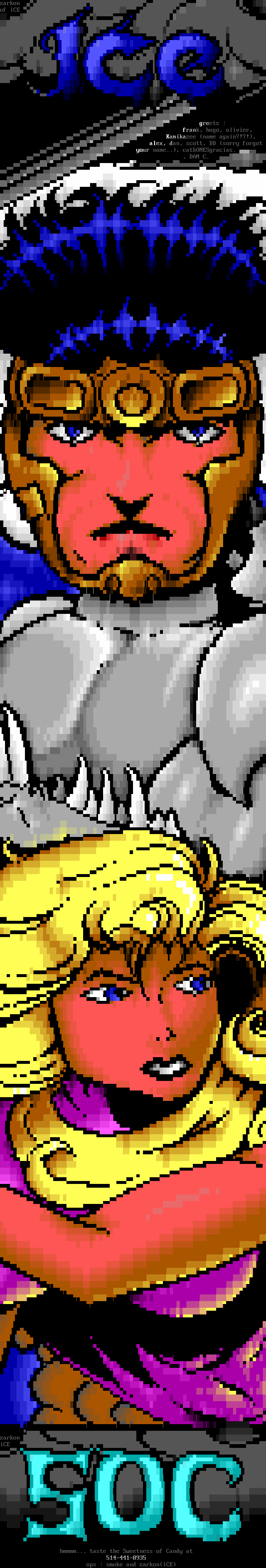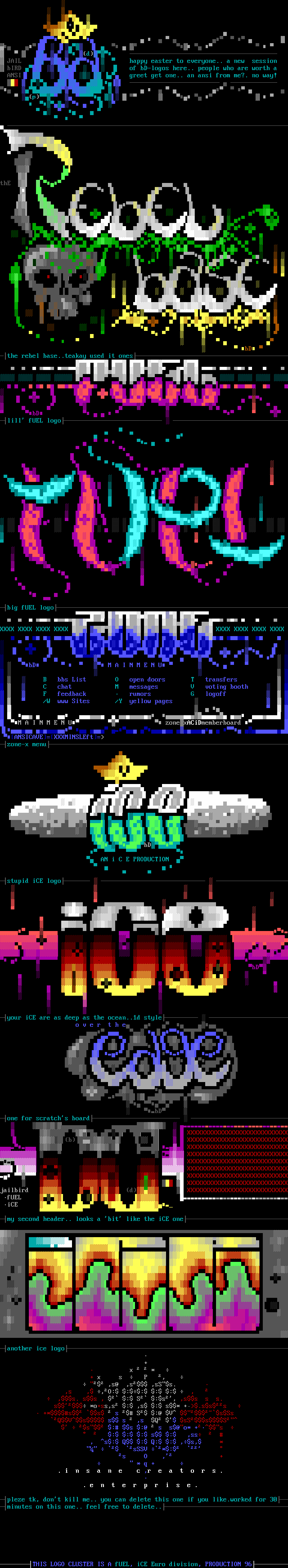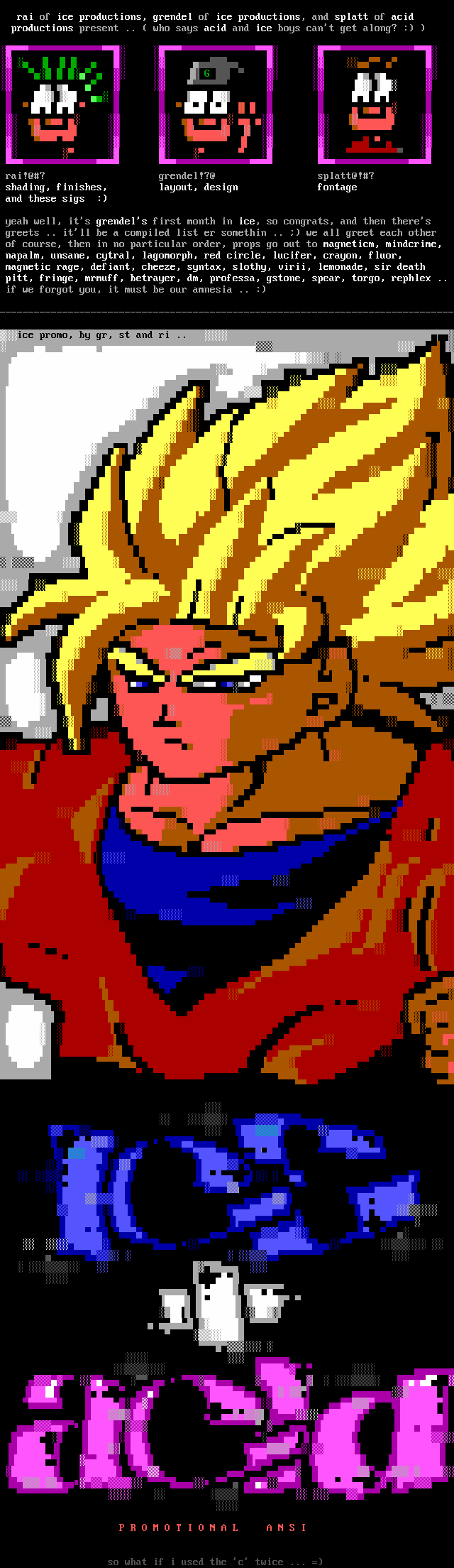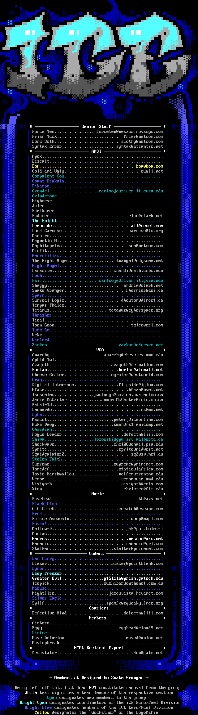 6. iCE would like to welcome another large batch of new artists to the group! In ANSI, we welcome Grendel, Grindstone, and Zarkon. In VGA, Shiva and Stolen Faith join the happy family. Also, Lintec joins us as a member.
