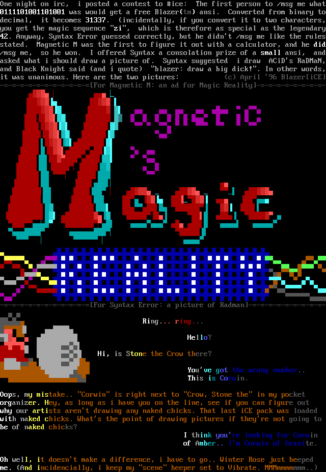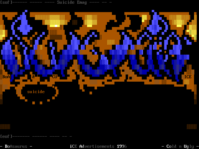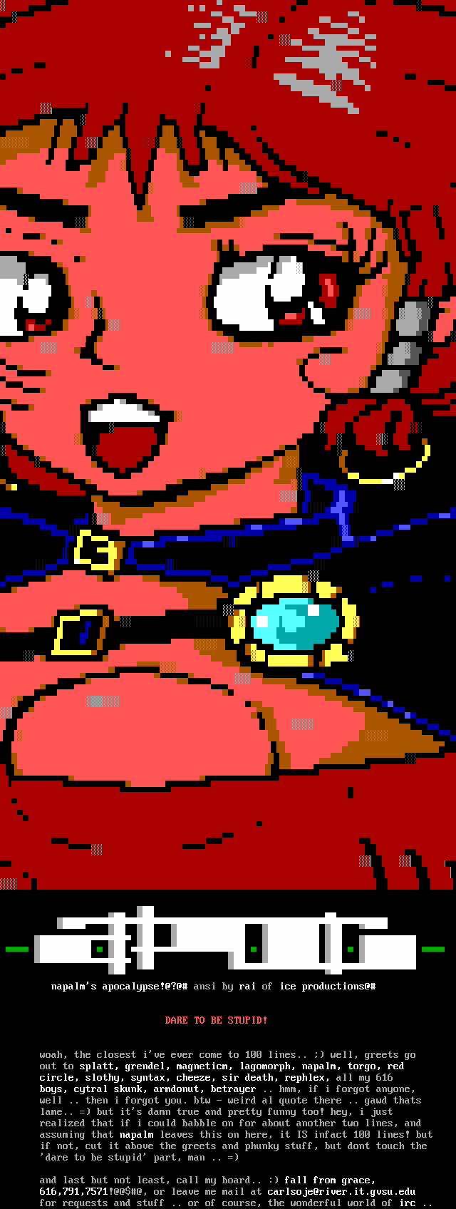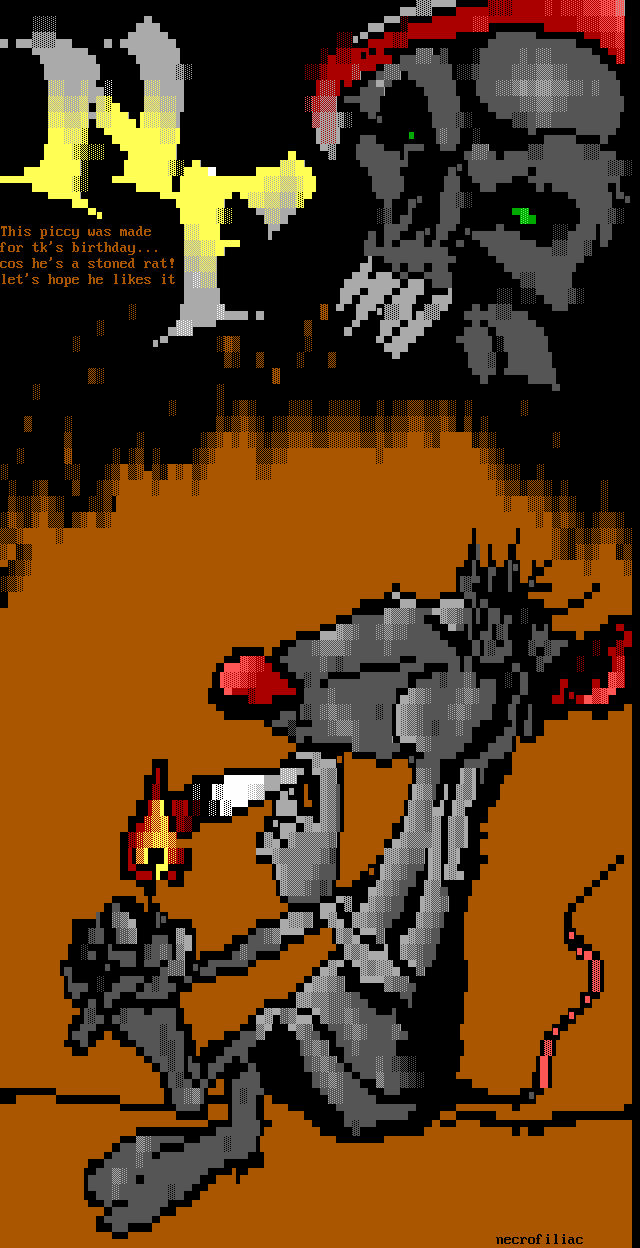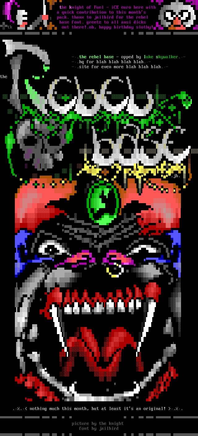13. This month iCE has released Neurotic's retirement ANSI. A former member of the group, Neurotic has been one of the scene's more prolific artists during his tenure. Neurotic was most recently with Legend, but rejoined to release his final work. After this month, Neurotic will become inactive, and we can only hope that he will come out of retirement one day in the future. Good luck, Neurotic, and good-bye.