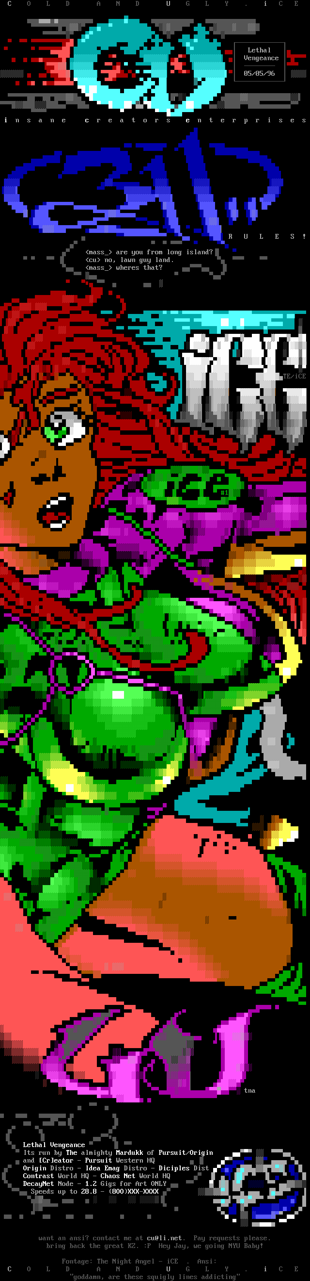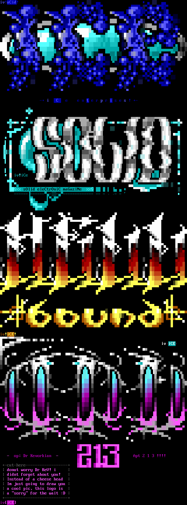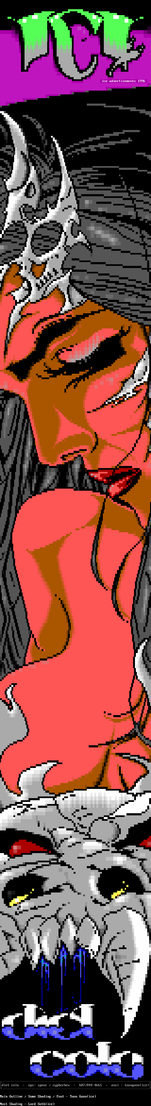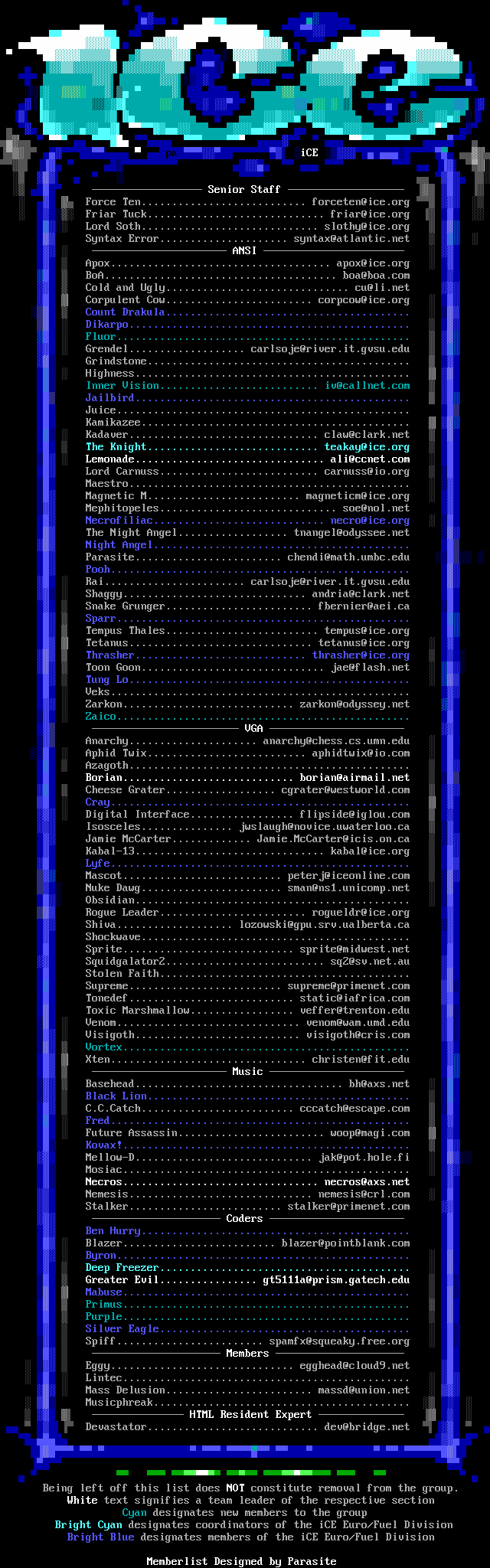 4. A very warm welcome to Inner Vision and Fluor from ACiD. These guys bring a wealth of ANSI talent to the party, as Zaico has for the iCE Euro team. Greater Evil found a pair of talented coders named Primus and Purple, from whom you can expect to see great things. And the VGA team picked up Vortex, whose eye candy ranks right up there. The music team did not pick up anyone, although they were seen growling seductively at a passing construction worker in cutoff jeans.