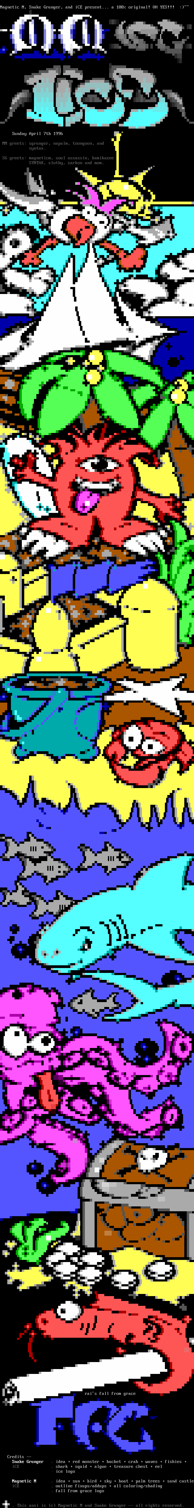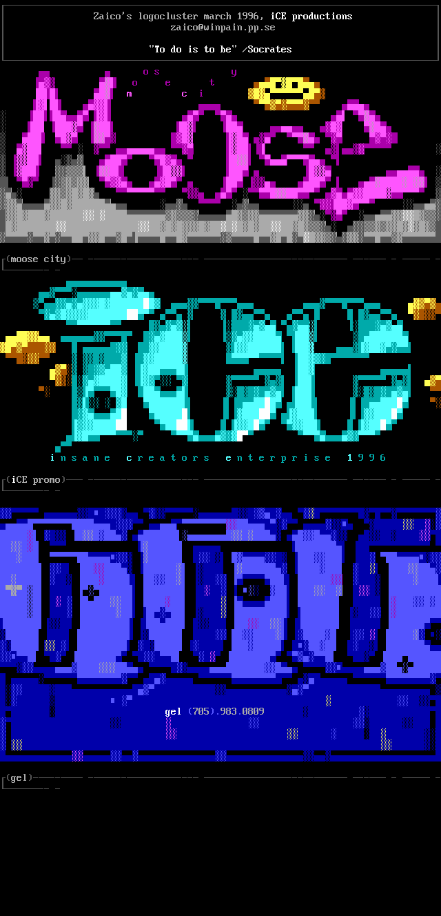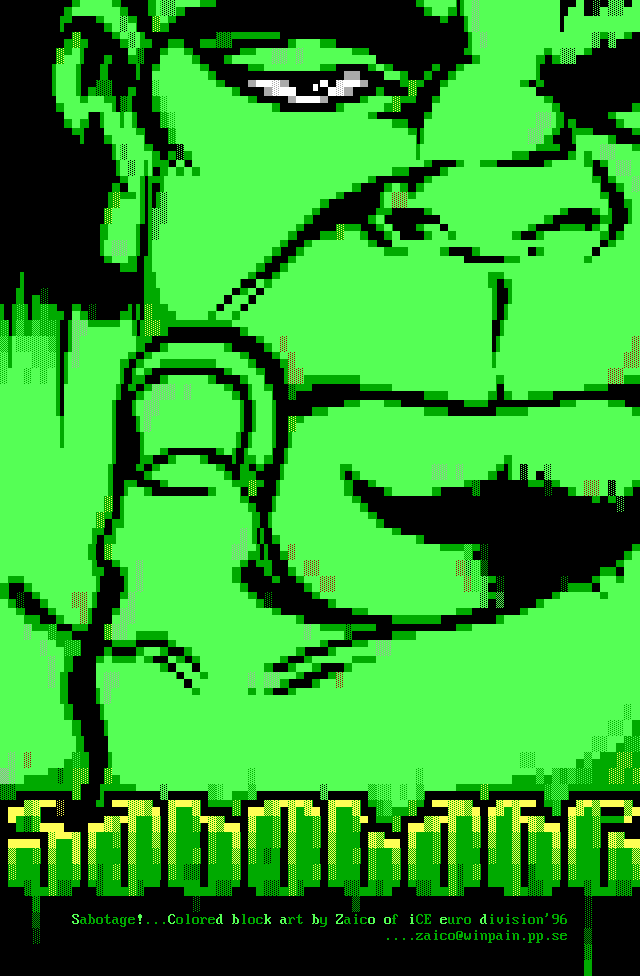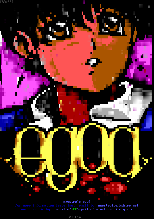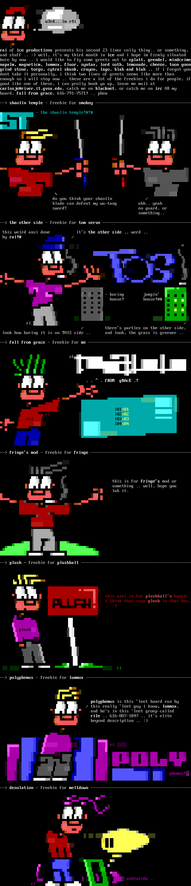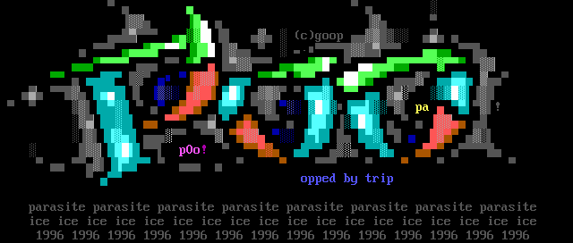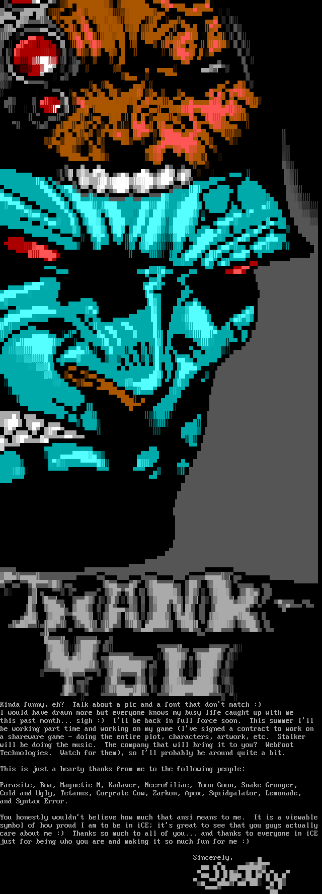 4. A very warm welcome to Inner Vision and Fluor from ACiD. These guys bring a wealth of ANSI talent to the party, as Zaico has for the iCE Euro team. Greater Evil found a pair of talented coders named Primus and Purple, from whom you can expect to see great things. And the VGA team picked up Vortex, whose eye candy ranks right up there. The music team did not pick up anyone, although they were seen growling seductively at a passing construction worker in cutoff jeans.