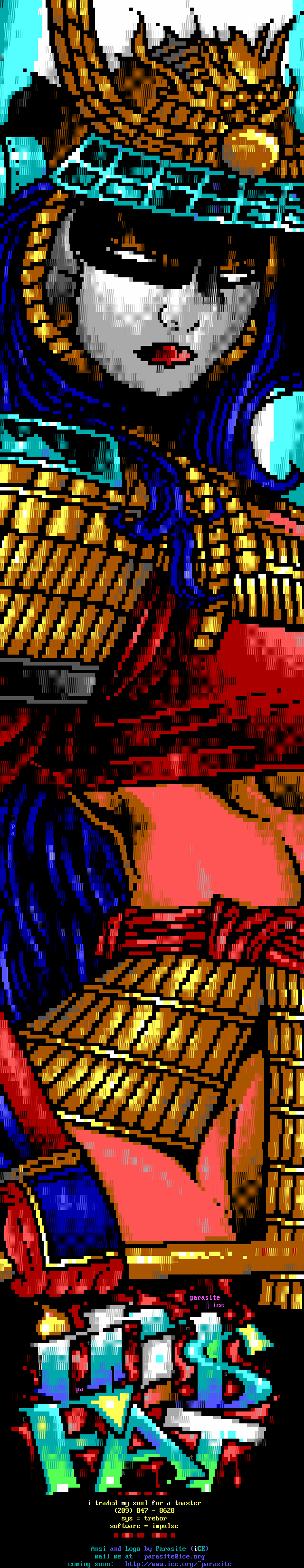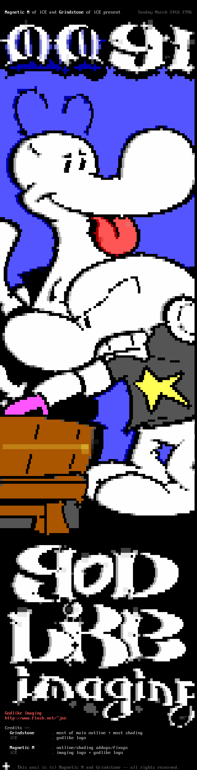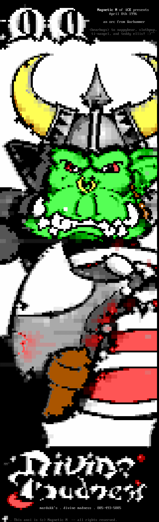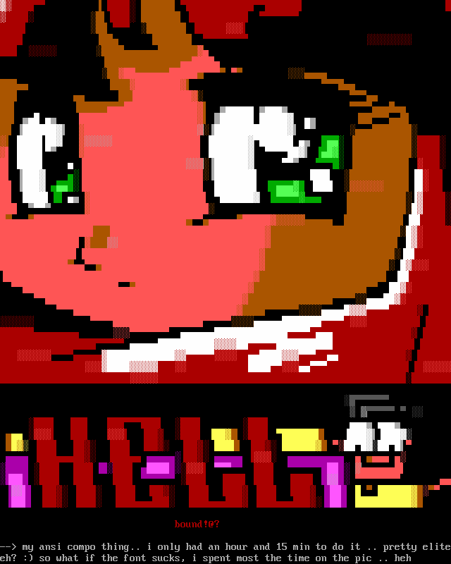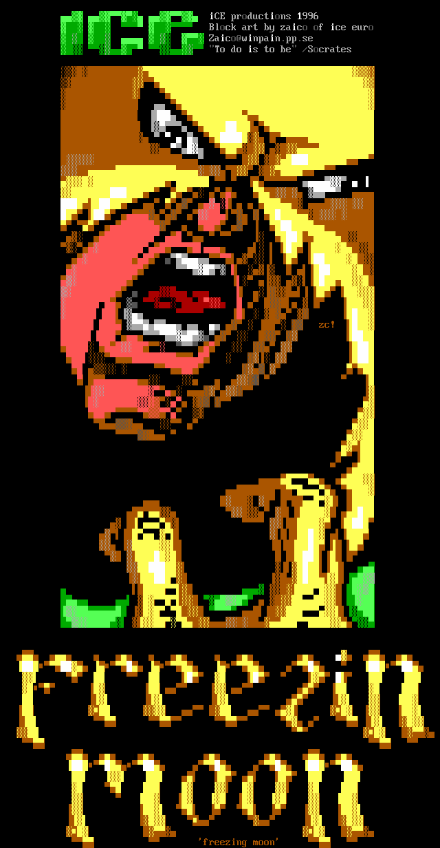 4. A very warm welcome to Inner Vision and Fluor from ACiD. These guys bring a wealth of ANSI talent to the party, as Zaico has for the iCE Euro team. Greater Evil found a pair of talented coders named Primus and Purple, from whom you can expect to see great things. And the VGA team picked up Vortex, whose eye candy ranks right up there. The music team did not pick up anyone, although they were seen growling seductively at a passing construction worker in cutoff jeans.