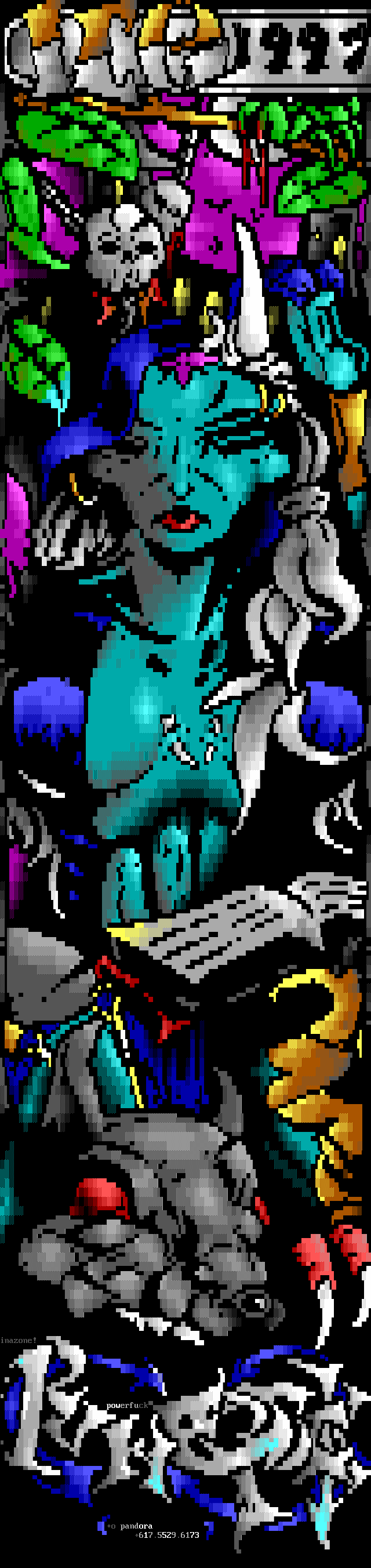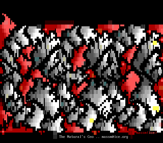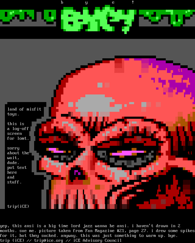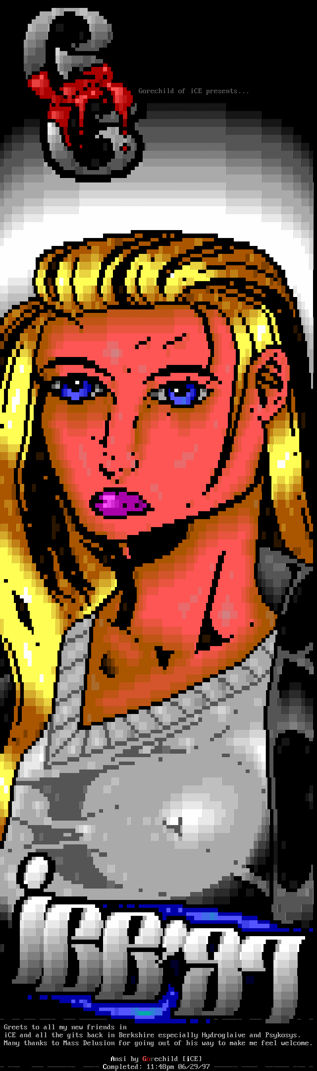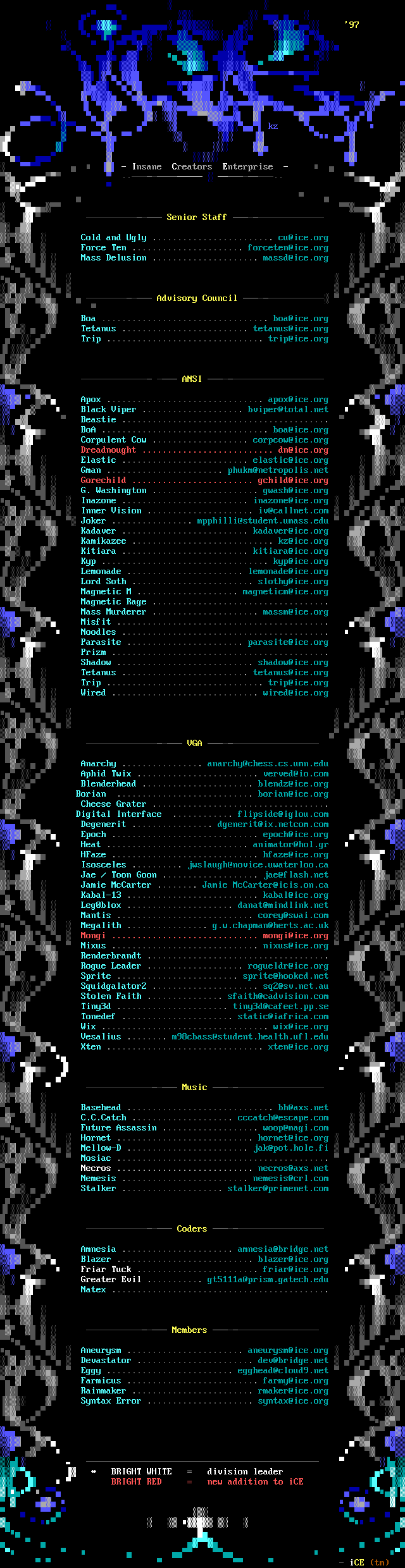 2. The great vacuum of persuasion and misinformation conned the following unsuspecting art troopers into iCE this month: Mongi to the VGA team, coming to us after leaving Twilight, and Gorechild and Dreadnought to the ANSI team. Trip feels ignored, so we felt it only appropriate to mention him here as well. Therefore, Trip joined iCE again, coming to us from... uhh.. iCE! Cheers to all the newbies!