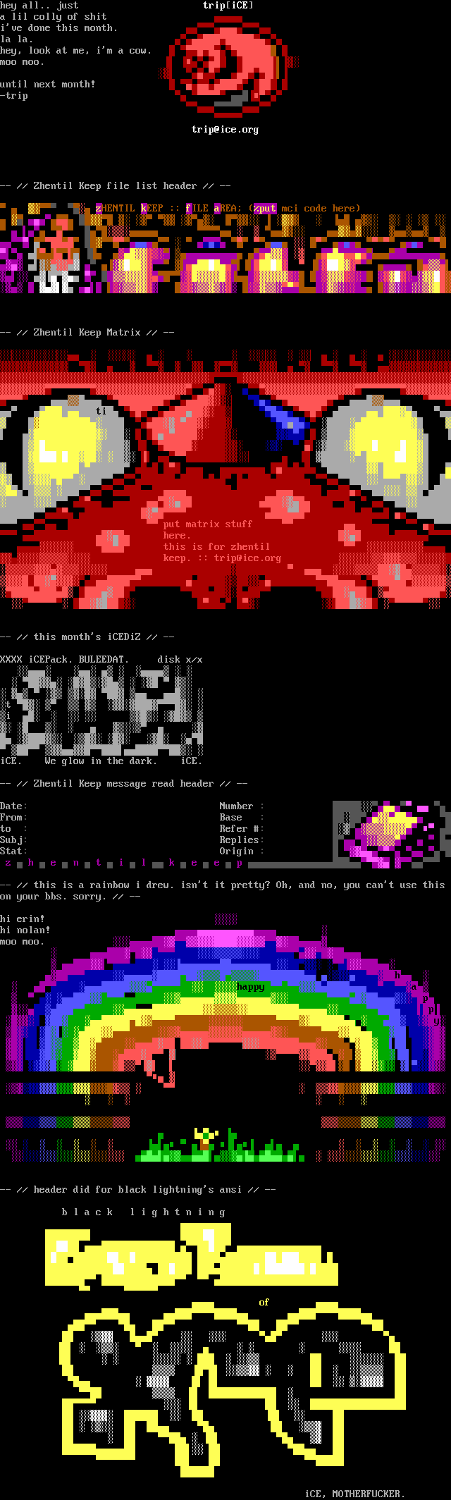 2. Our highly-paid recruiters disguised as religious prophets of impending doom and telephone psychics convinced the following wayward artists that salvation is in iCE this month: Fractal, who joins the ANSI team, and Cyberise in the VGA department. Also returning to the scene this month is Black Lighting, to the ANSI department. Welcome to our new mates.