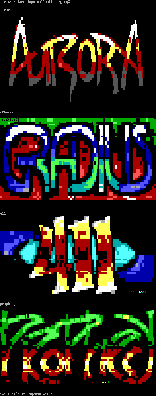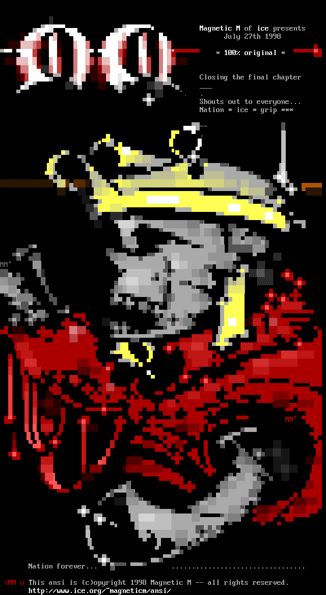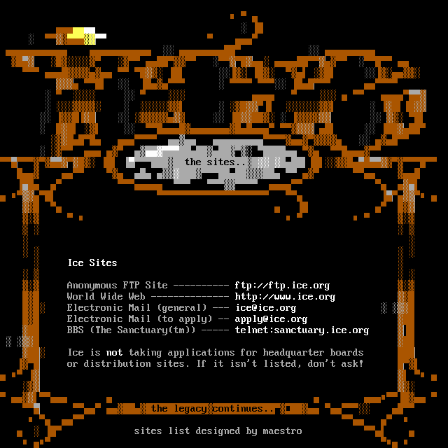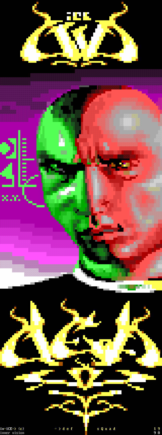 2. Much like the stock market, iCE has been slowly growing in value as we add incredible artists each month. Unlike the stock market (and much to the joy of the senior staff), we don't deal with those pithy crashes where we lose half of our holdings. Added this month to the creative collective is DaVinci, full of detailed high resolution screen taffy. This month also saw the talk down of Digital Interface from an eerie trip of ACiD, welcome boys.