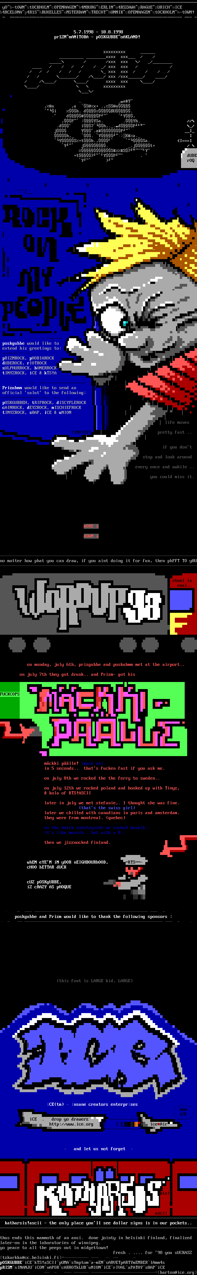 4. iCE T-Shirts, first mentioned about 4 years ago, finally made their way to the shelves of corporate America (right down the street from our HQ, of course)! These new shirts are currently only available in white and feature the crazy sketches of Vesalius - world-renowned for tastelessness and obsession with poop. If _that_ doesn't make you want one, what would? Point your favorite web browser in the general direction of http://www.ice.org/~massd/tees Rumor has it, according to some, that t-shirts come with free iCE ansi!??
