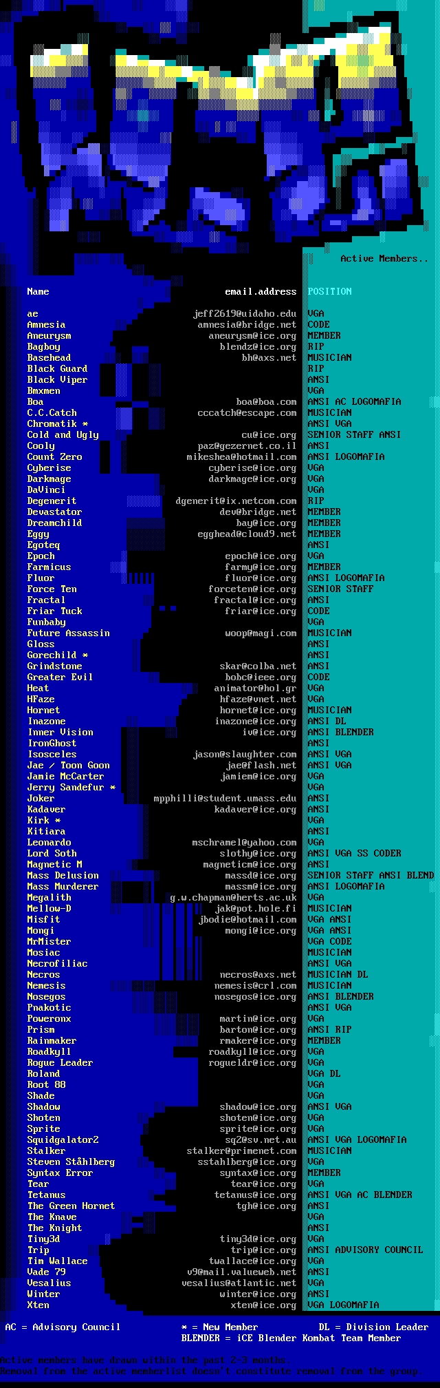 7. In what media analysts are calling an unbelievable string of legitimate news in the April 1999 Info file, iCE stuns again by announcing that iDraw 1.0 will be released this month. To the average Tetanus or Trip, iDraw becomes a powerful weapon, allowing them to avenge any injustices in the scene. Learn to be a warrior like them, get iDraw 1.0 and just draw! If you think an iCE sponsored drawing is keen, wait until we wow you with tutorial "plug-ins" and iCE members recreated in ANSI doing the macerena!
