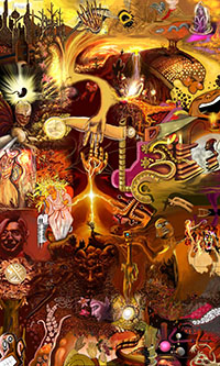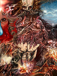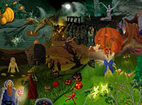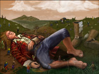 Bring color to this painting of Samuel Gulliver as he lays on the beach, exhausted from the storm, and add the Lilliputians, running around him in disbelief, while some tie him down, ceasing those moments when he is not awake and resisting.